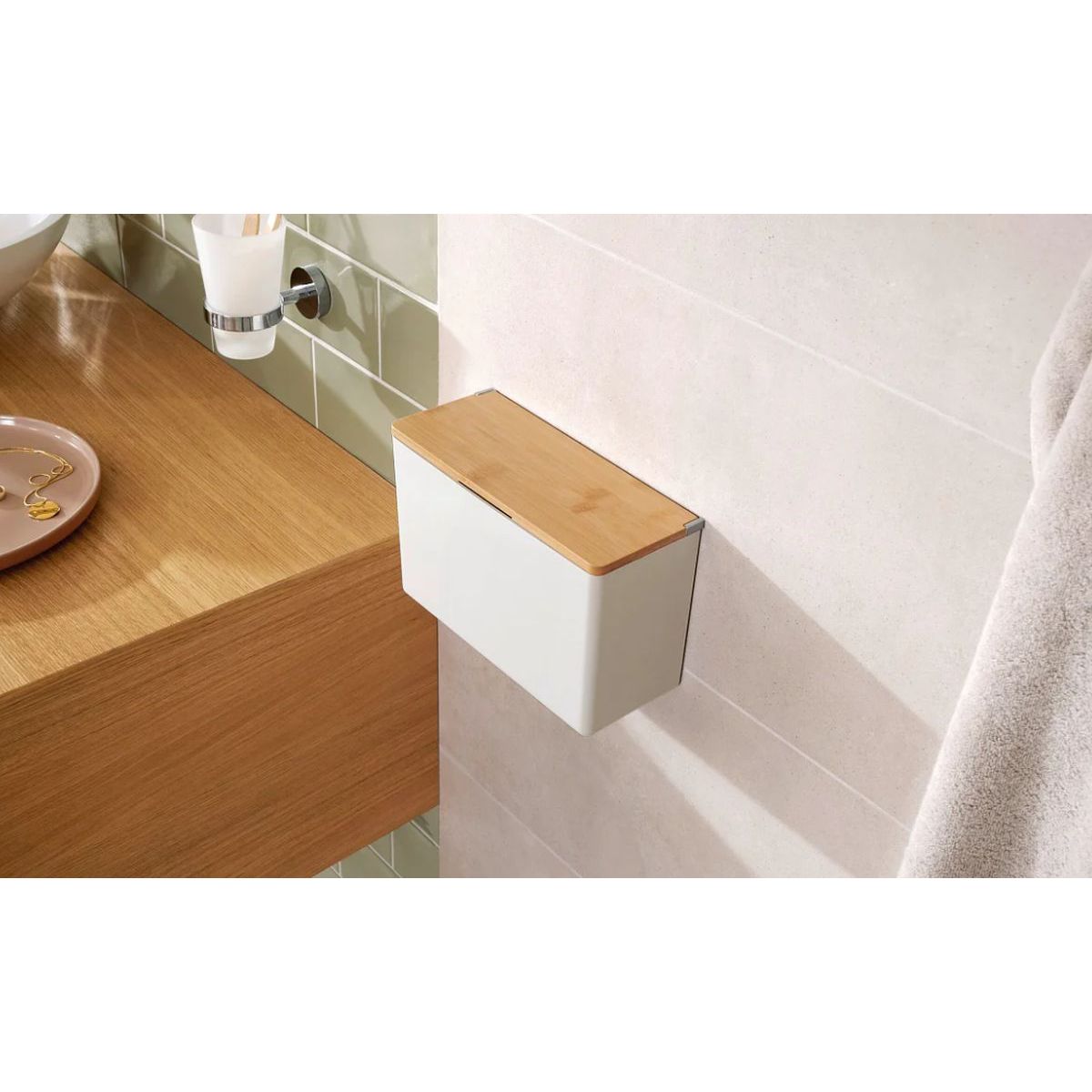 - Aufbewahrungsbox, die mit wasserfesten tesa® Powerstrips Waterproof Befestigungsstreifen befestigt wird (selbstklebende Befestigungslösung, die keine