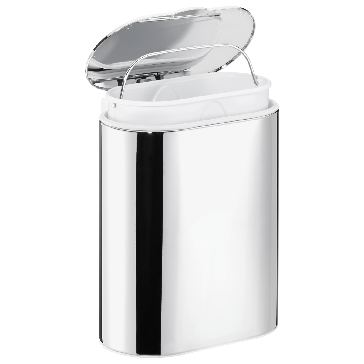 Selbstklebender Abfallbehälter tesa® Elegaant aus verchromtem Metall mit sanft schließendem Kunststoffdeckel.