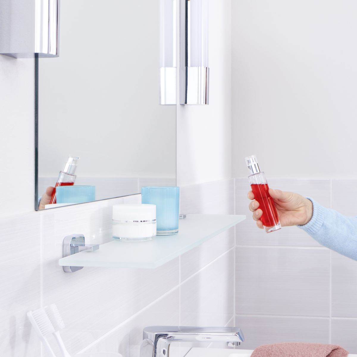 Ein äußerst elegantes und verantwortungsbewusstes Element der Badezimmerausstattung. Da sie meist über dem Waschbecken angebracht wird, muss sie sich durch eine sichere Befestigung auszeichnen. Genau das bietet die patentierte tesa-Technologie ohne Bohren. Die Kombination aus einem Kupferadapter und einer Klebemasse mit einer Trocknungszeit von 12 Stunden garantiert eine sehr solide Befestigung an der Wand, ohne die Oberfläche zu beschädigen. Ein elegantes und effektvolles Element der Badezimmerausstattung zur Aufbewahrung von Toilettenartikeln – das ist das Regal, das eine Kombination aus satiniertem Glas und hochglänzenden Chromgriffen mit abgerundeten Ecken ist. Das Badezimmerregal aus satiniertem Glas kann jederzeit leicht demontiert werden. Für die erneute Montage des Regals an einer anderen Stelle ist ein neuer Adapter BK20-2 erforderlich.