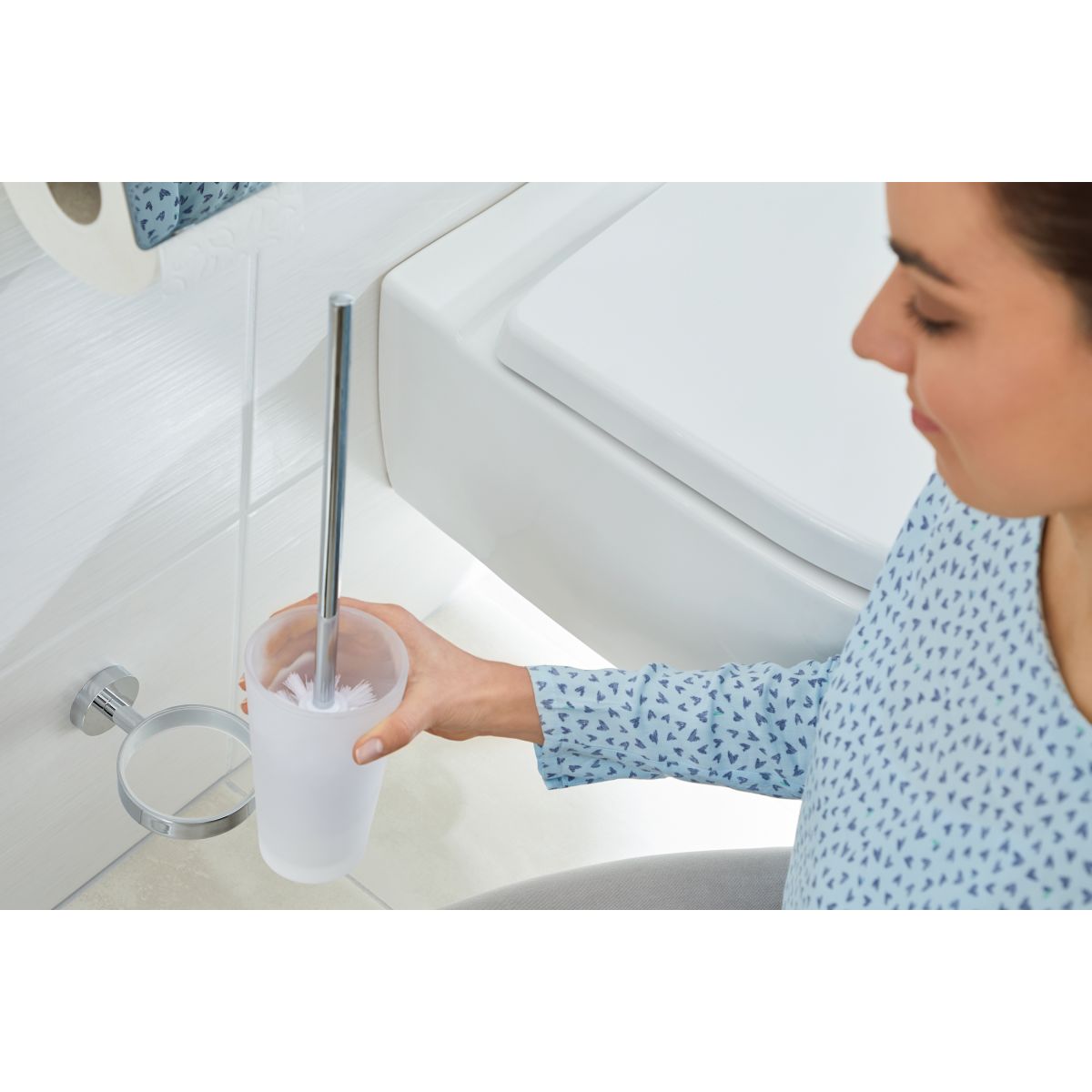 Die Toilettenbürste tesa® Smooz mit selbstklebender Befestigungstechnologie für die Wand, hochglanzverchromt.