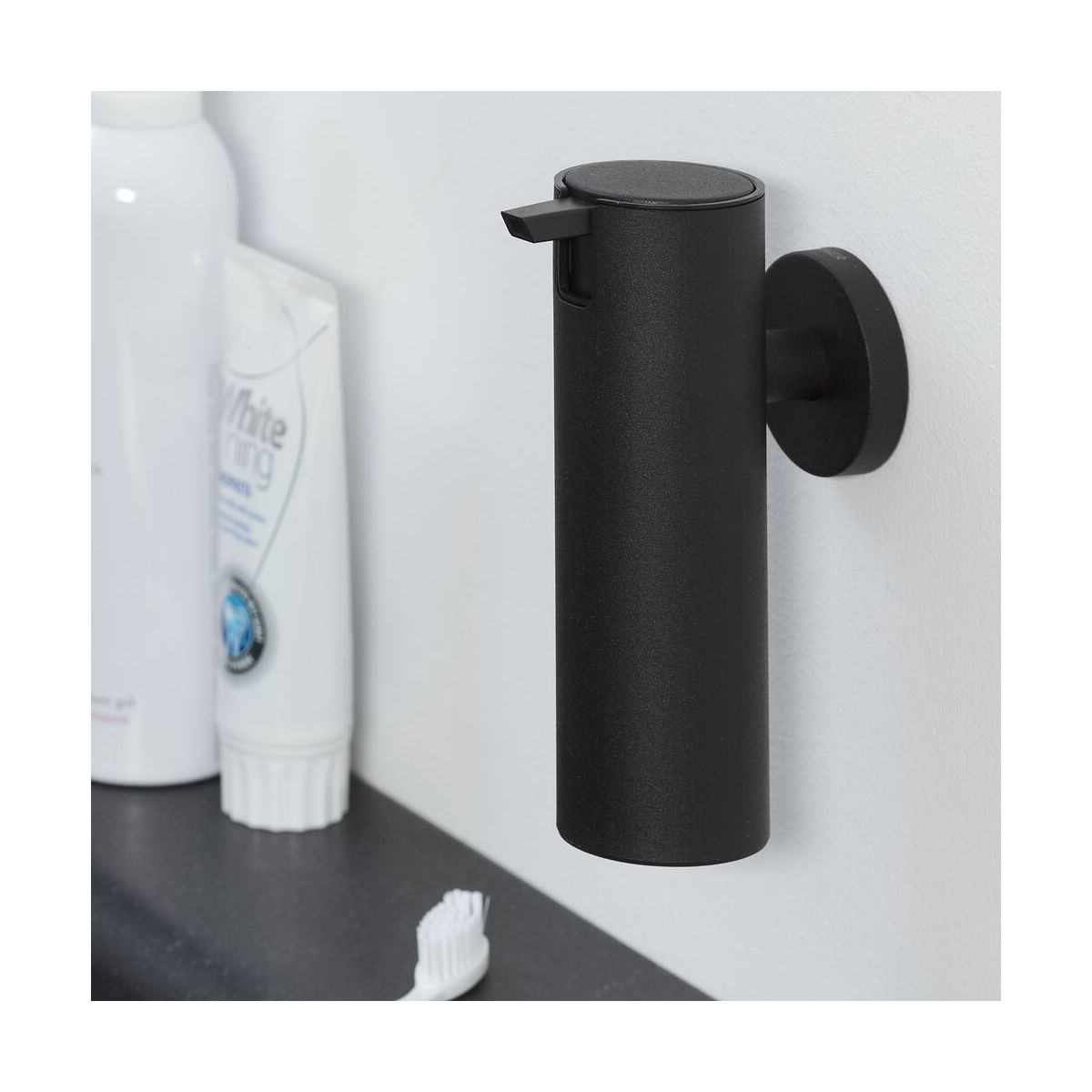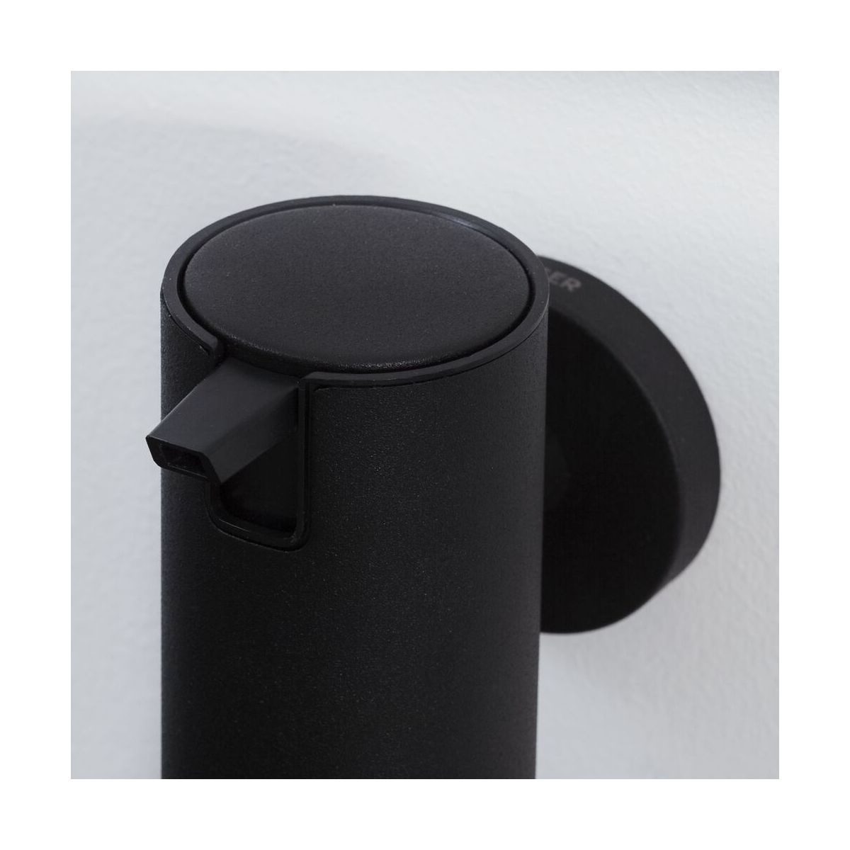 - Der Kunststoffbehälter für Seife lässt sich zum Befüllen leicht aus der Halterung herausnehmen