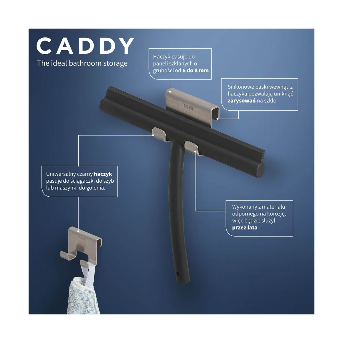 Klein ist schön, und der Haken für die Duschkabine Tiger Caddy ist eine kleine Schönheit, die eine große Wirkung erzielt. Hängen Sie den Haken an Ihrer Duschkabine oder an einer Glaswand auf. Das Glas wird durch eine Silikonbeschichtung dauerhaft geschützt. Der Haken eignet sich zum Aufhängen von Abziehern, Rasierern oder Handtüchern. Einfach, funktional und zeitlos. Caddy ist der Schlüssel zu einem Gefühl der Entspannung in Ihrem Badezimmer.
