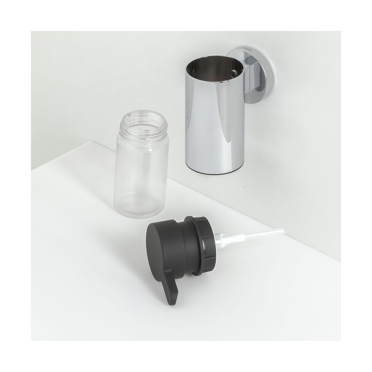 - Der Kunststoffbehälter für Seife lässt sich zum Nachfüllen leicht aus der Halterung herausnehmen