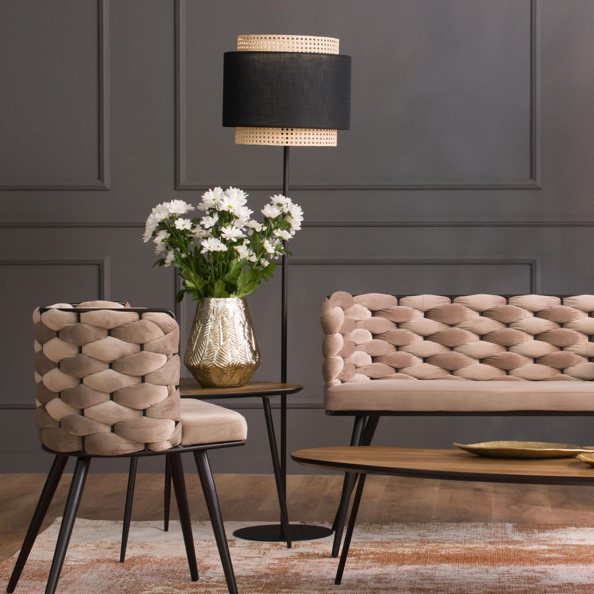 - Material: Stoff/Seide, Metall, Rattan