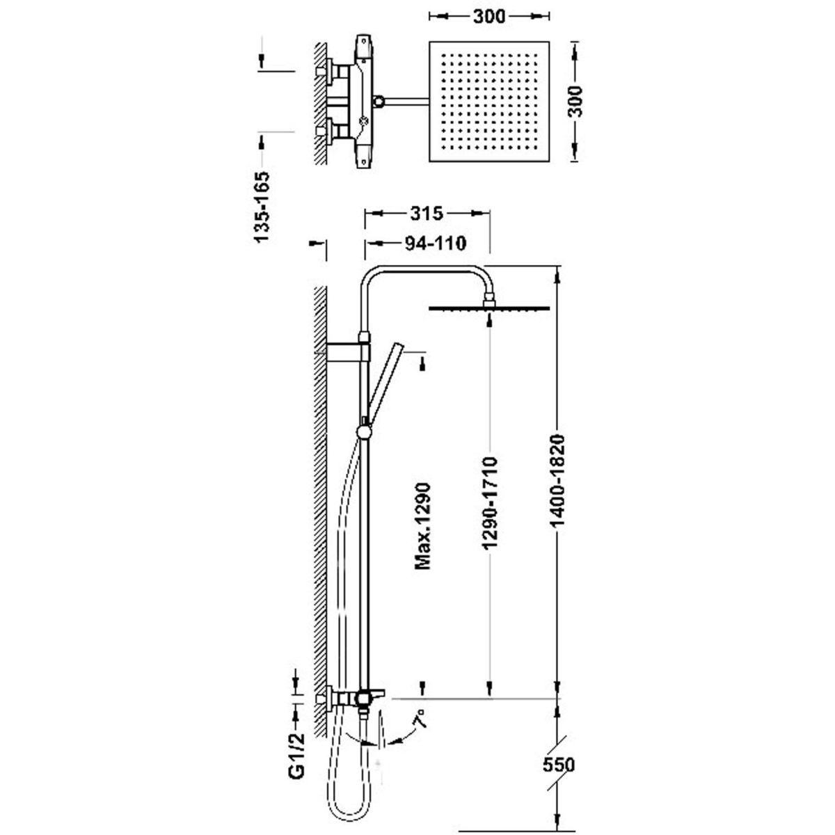 - drehbare Regendusche aus Edelstahl: 30 x 30 cm