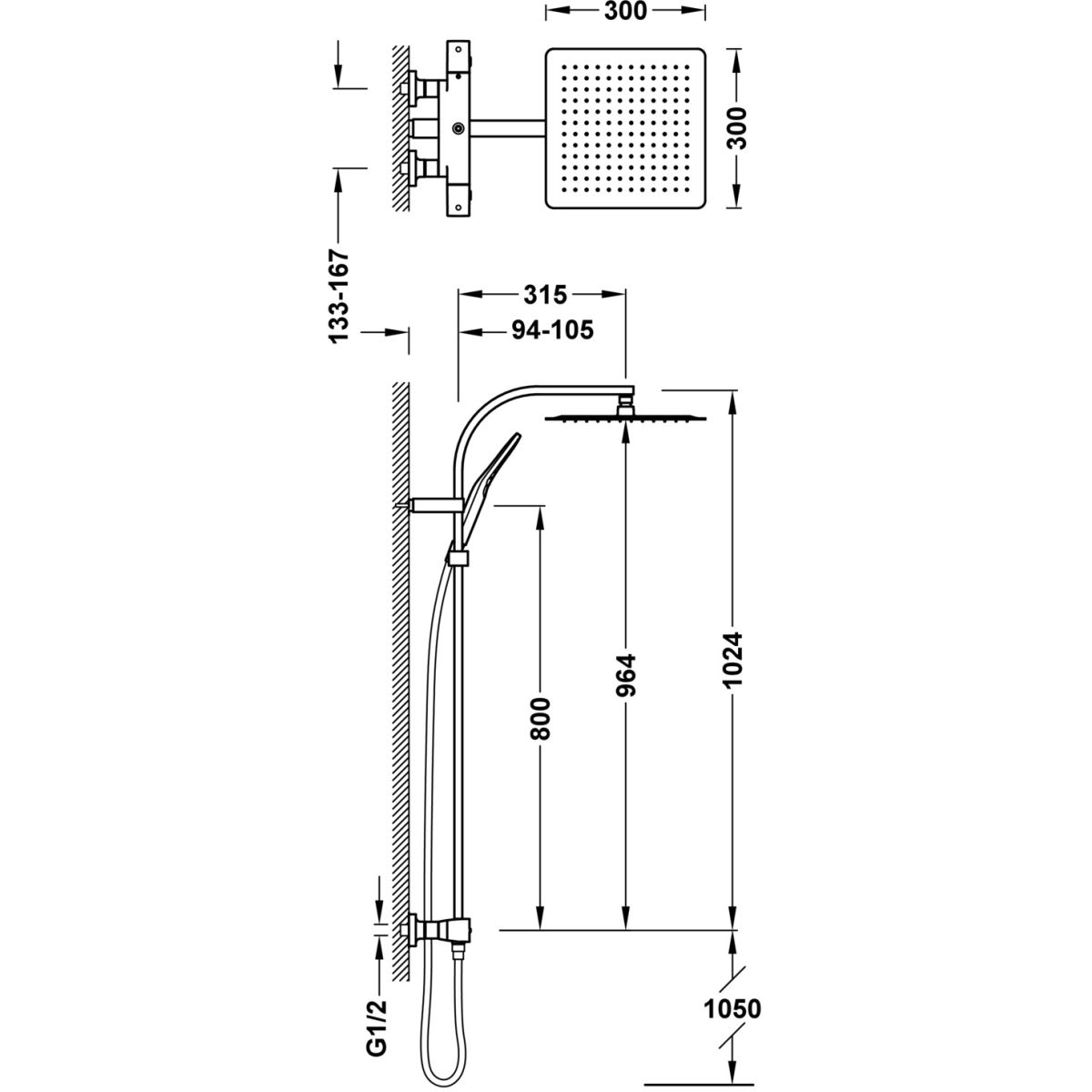 - bewegliche Regendusche aus Edelstahl: 300 x 300 mm