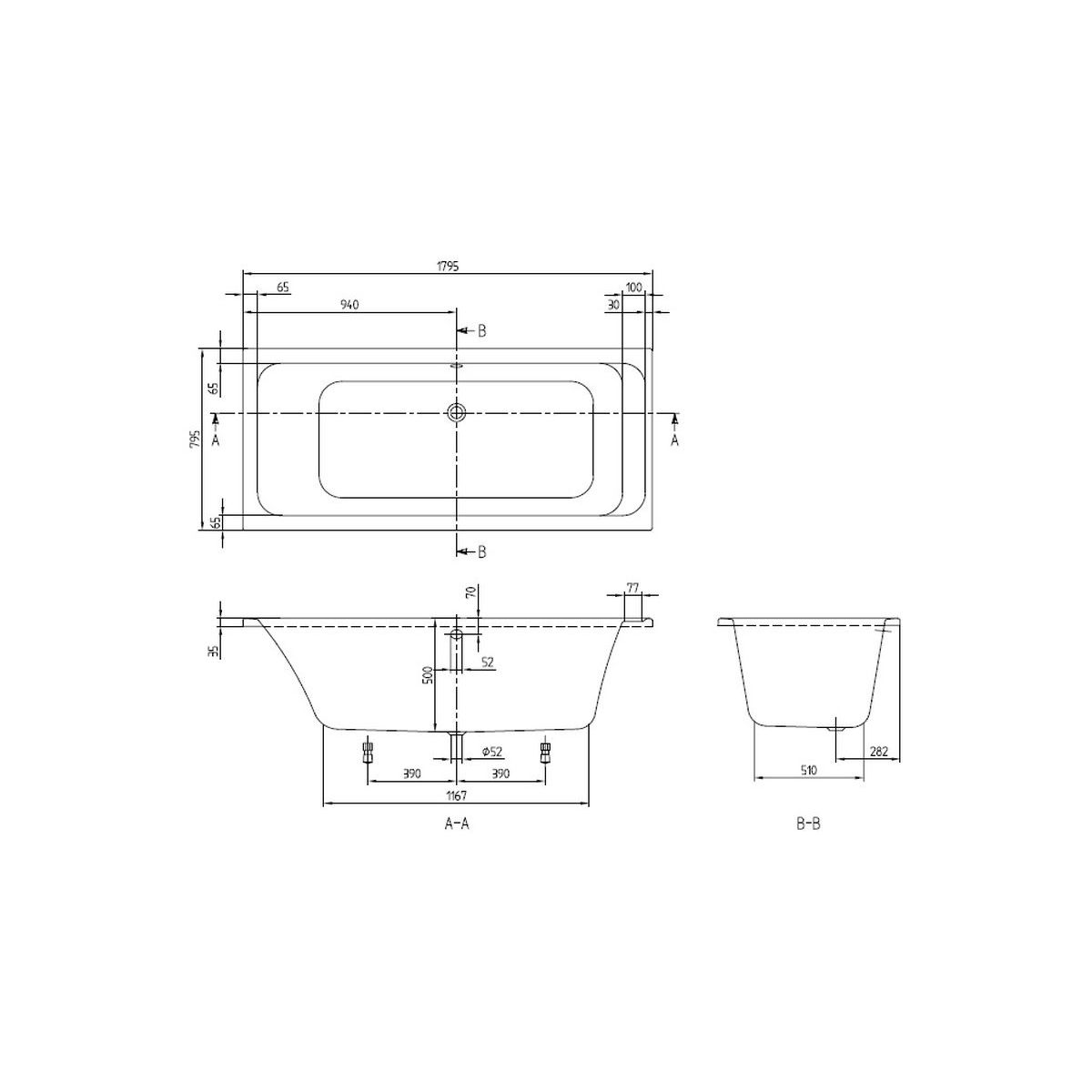 - Maße des Wannenbodens: 116,7 x 51 cm