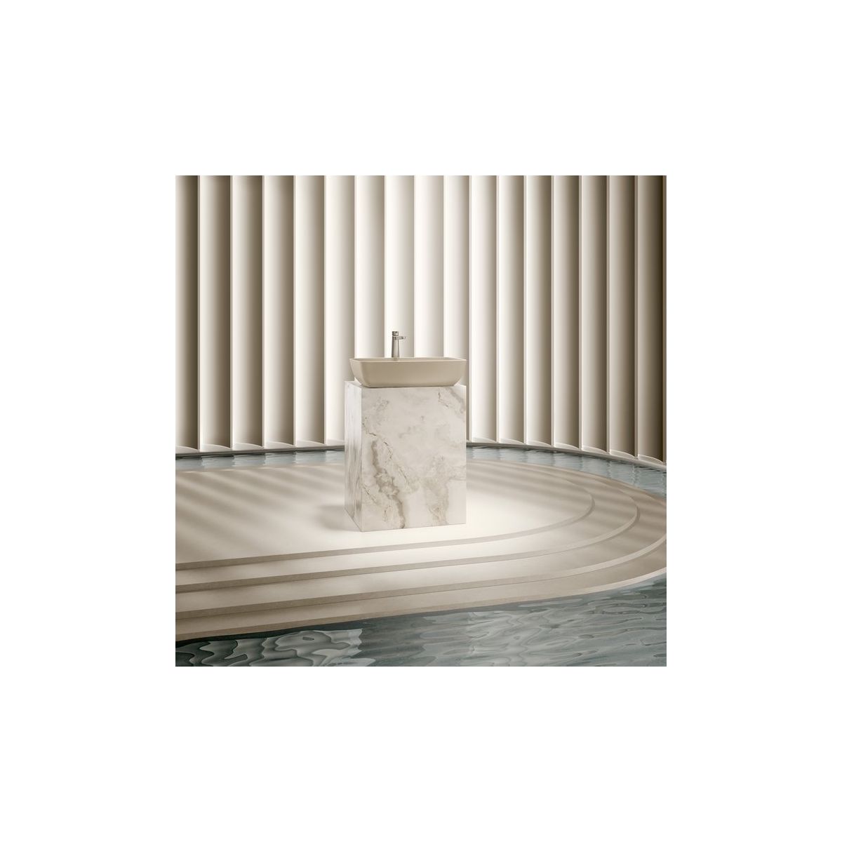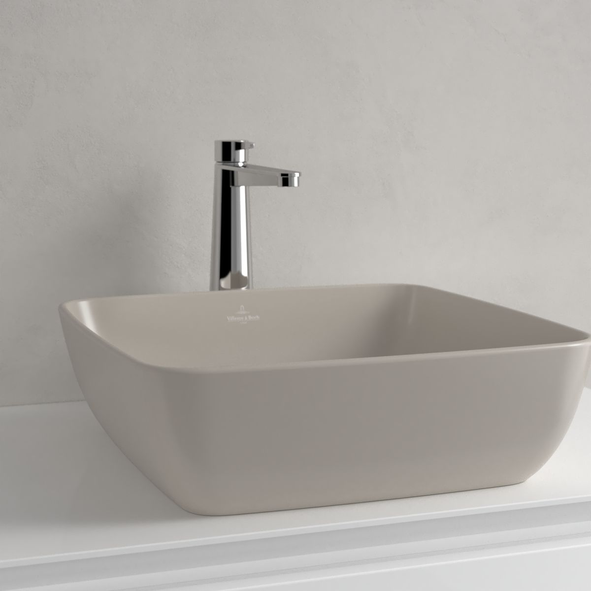 Das quadratische Aufsatzwaschbecken aus der Artis-Kollektion von Villeroy & Boch besticht durch seine besonders dünnen Wände und zarten Konturen dank des innovativen Materials TitanCeram, das selbst Waschbecken mit schmalen Rändern extrem widerstandsfähig und langlebig macht. Das Waschbecken hat außerdem eine praktische Tiefe von 10 cm, die das Händewaschen sehr komfortabel macht und den Bereich um das Waschbecken vor Spritzwasser schützt. Dank der schmutzabweisenden Oberfläche ist die Reinigung äußerst einfach. Die moderne, matte Oberfläche auf der gesamten Fläche eignet sich hervorragend als Designakzent. Zusammen mit den passenden Möbeln aus der Legato- oder Finion-Kollektion wird das Waschbecken zu einem echten Blickfang im Badezimmer.