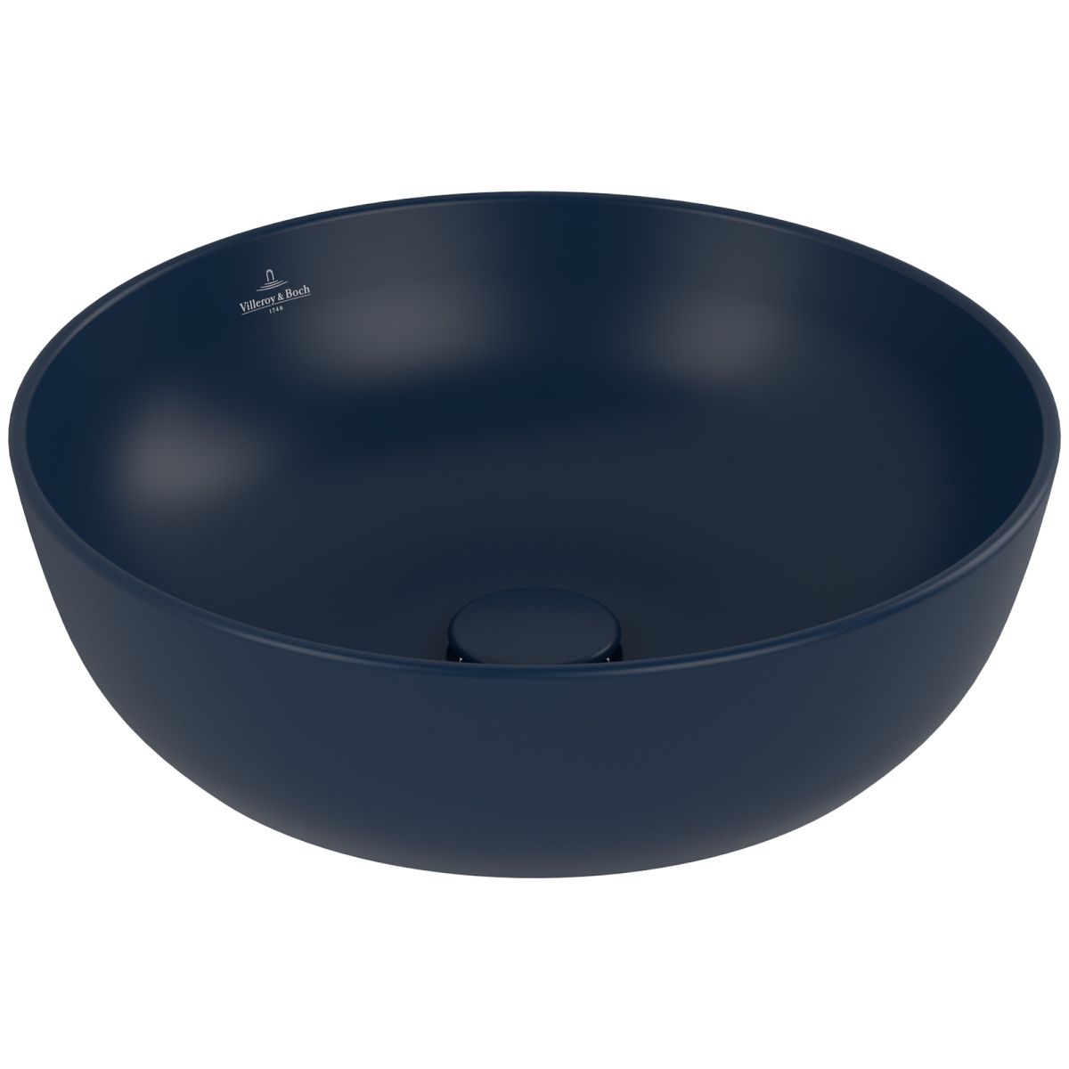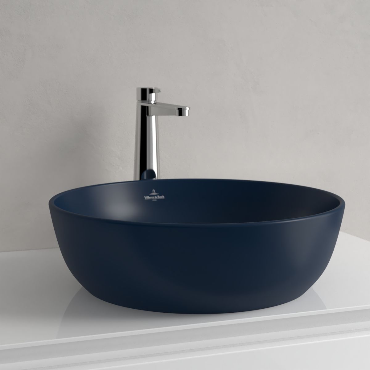 Das runde Standwaschbecken aus der Artis-Kollektion von Villeroy & Boch besticht durch seine besonders dünnen Wände und zarten Konturen dank des innovativen Materials TitanCeram, das selbst Waschbecken mit schmalen Rändern extrem widerstandsfähig und langlebig macht. Das Waschbecken hat außerdem eine praktische Tiefe von 10 cm, wodurch das Händewaschen sehr bequem ist und der Bereich um das Waschbecken vor Spritzwasser geschützt wird. Dank der schmutzabweisenden Oberfläche ist die Reinigung äußerst einfach. Die tiefe, elegante dunkelblaue Farbe und die moderne matte Oberfläche auf der gesamten Fläche eignen sich hervorragend als Designakzente. Zusammen mit den passenden Möbeln aus der Legato- oder Finion-Kollektion wird das Waschbecken zu einem echten Blickfang im Badezimmer.