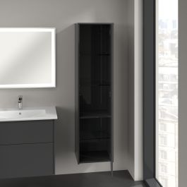 Seitenschrank, hoch, zur Wandmontage, in der Farbe Glossy Grey – glänzendes Grau, mit Türen – Öffnen durch „Push-to-open”-Funktion und Schließen durch „Push-to-close”-Funktion. Die Scharniere befinden sich auf der rechten Seite. Im Inneren des Schranks befinden sich insgesamt fünf Einlegeböden, darunter drei Glasböden, deren Höhe verstellbar ist. Der Schrank eignet sich ideal zur Aufbewahrung von Handtüchern, verschiedenen Gegenständen und Kosmetika, die im Badezimmer täglich benötigt werden.