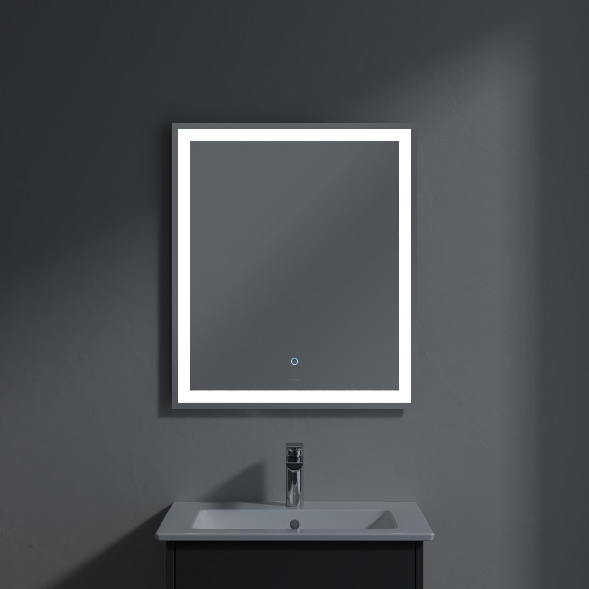 - Sensor zum Ein- und Ausschalten der Beleuchtung im unteren mittleren Teil des Spiegels