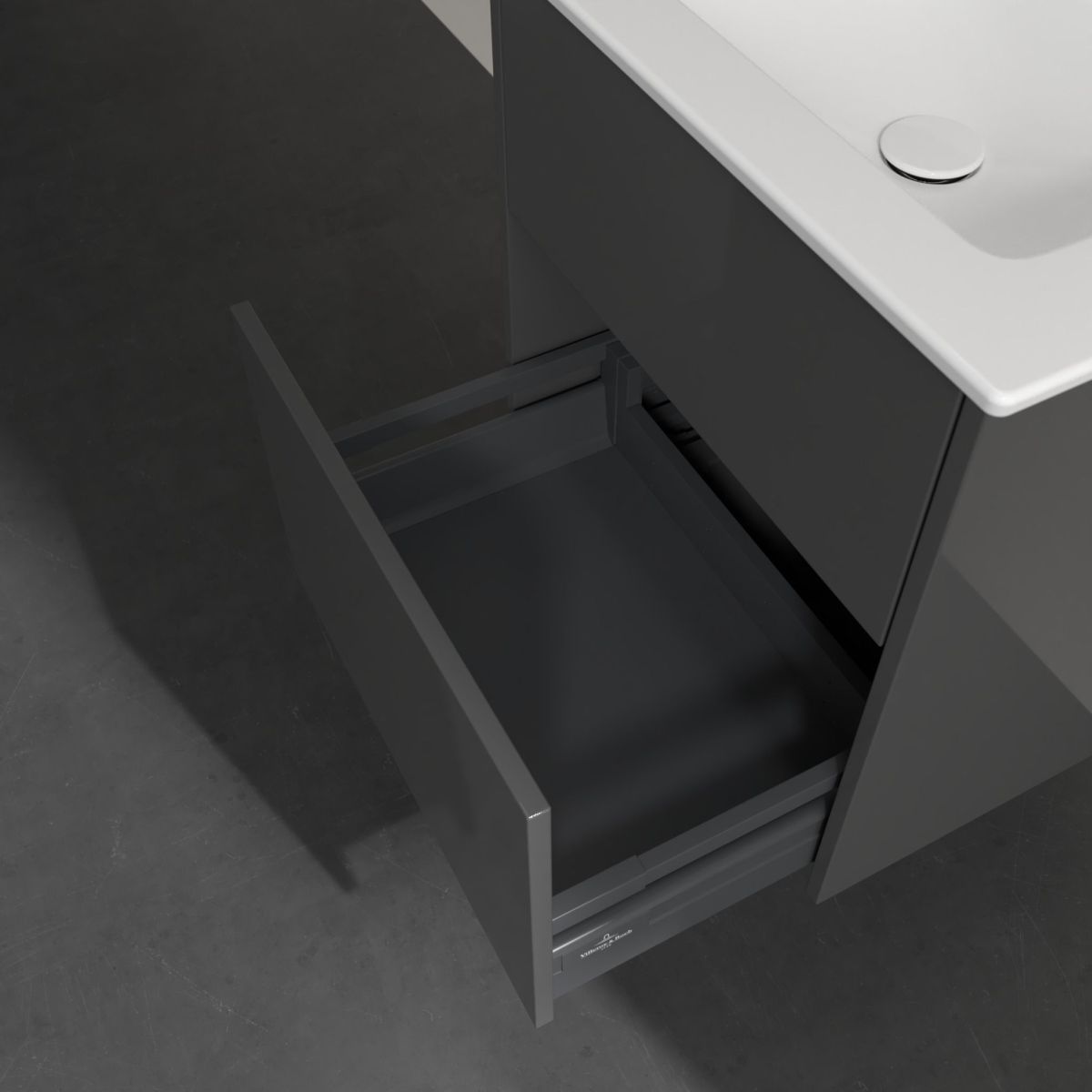 Der an der Wand montierte Waschbeckenunterschrank in der Farbe Glossy Grey – glänzendes Grau – ist mit zwei Schubladen ausgestattet, die sich per Push-to-open-Funktion öffnen lassen und sanft schließen. Die obere Schublade eignet sich ideal zur Aufbewahrung kleiner Gegenstände, die im Badezimmer täglich benötigt werden. Die untere Schublade hingegen kann als praktischer Stauraum für etwas größere Gegenstände wie beispielsweise einen Föhn oder ein Glätteisen genutzt werden. Die rutschfeste Matte am Boden der Schubladen schützt die darin befindlichen Gegenstände vor Verrutschen und Umkippen.