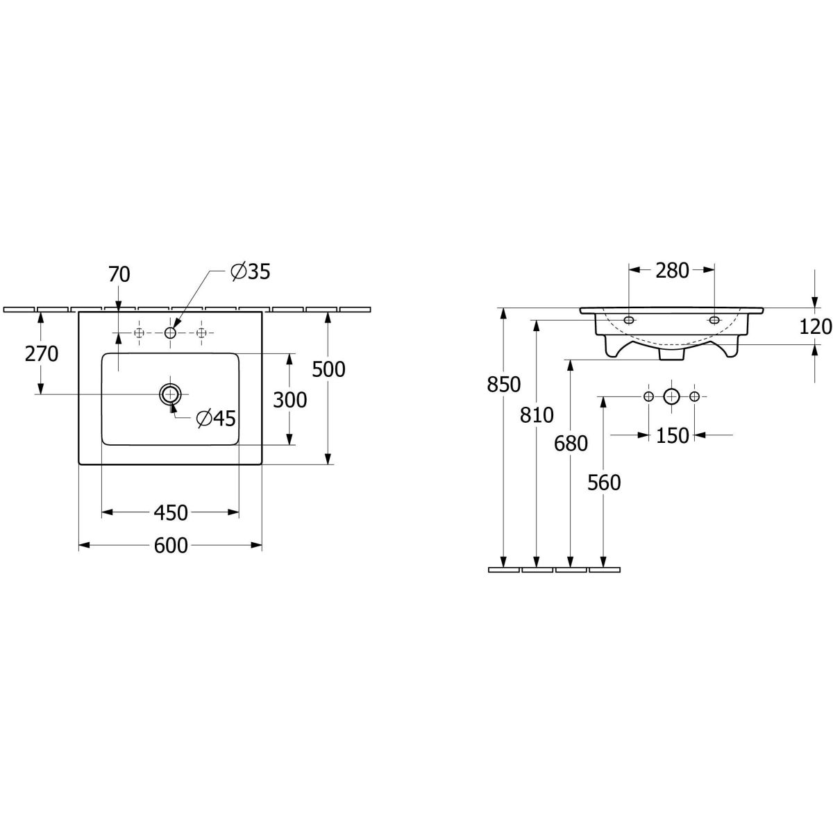 Abmessungen des Waschbeckens: