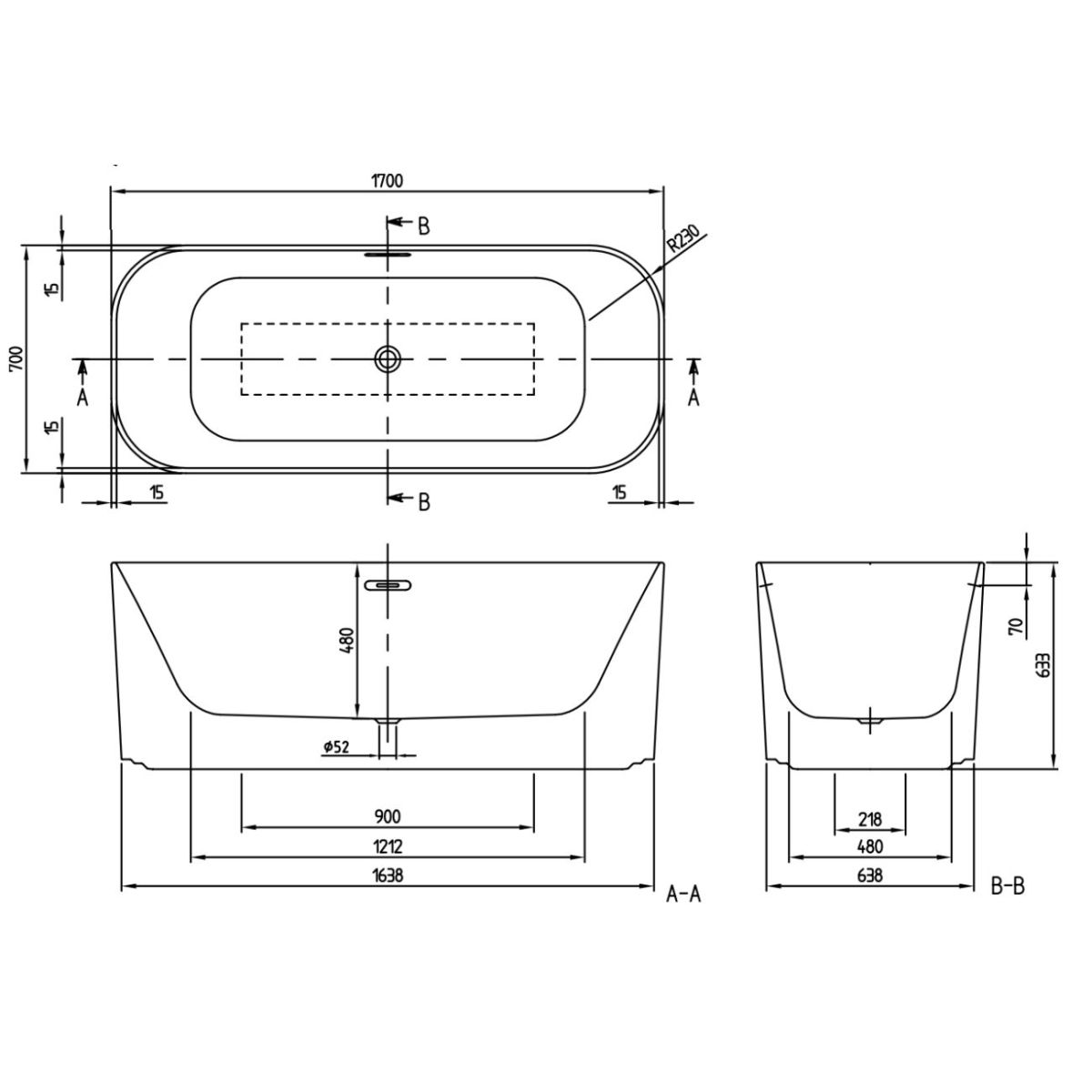 - Maße des Wannenbodens: 121,2 x 48 cm