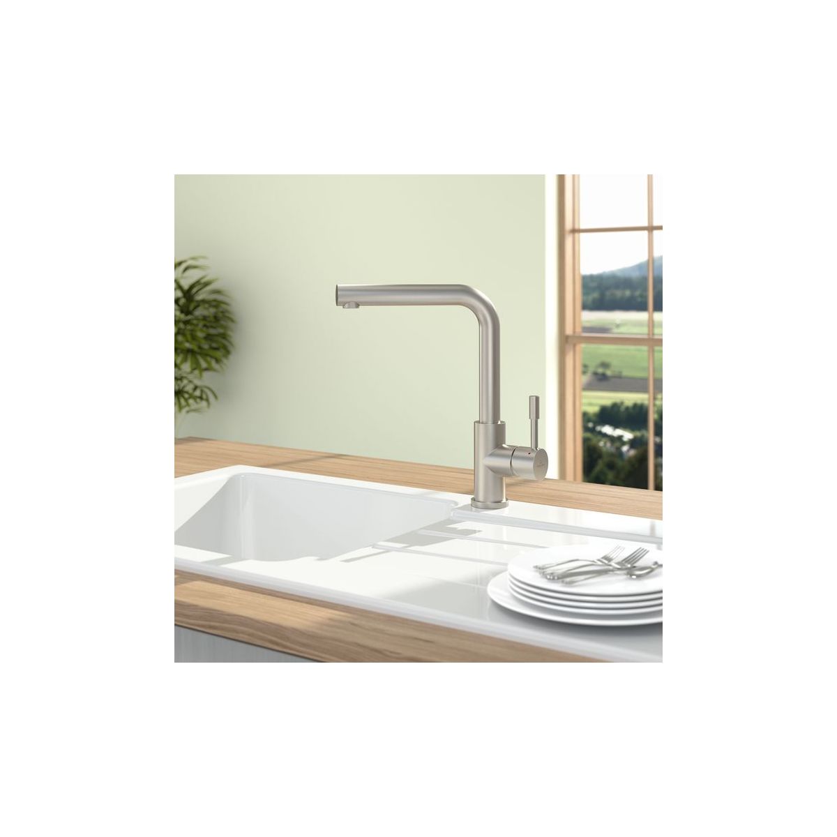 - Montage der Armaturen direkt an der Wand möglich, da die Regulierung von Kalt- und Warmwasser um 90° in Richtung Spülbecken erfolgt