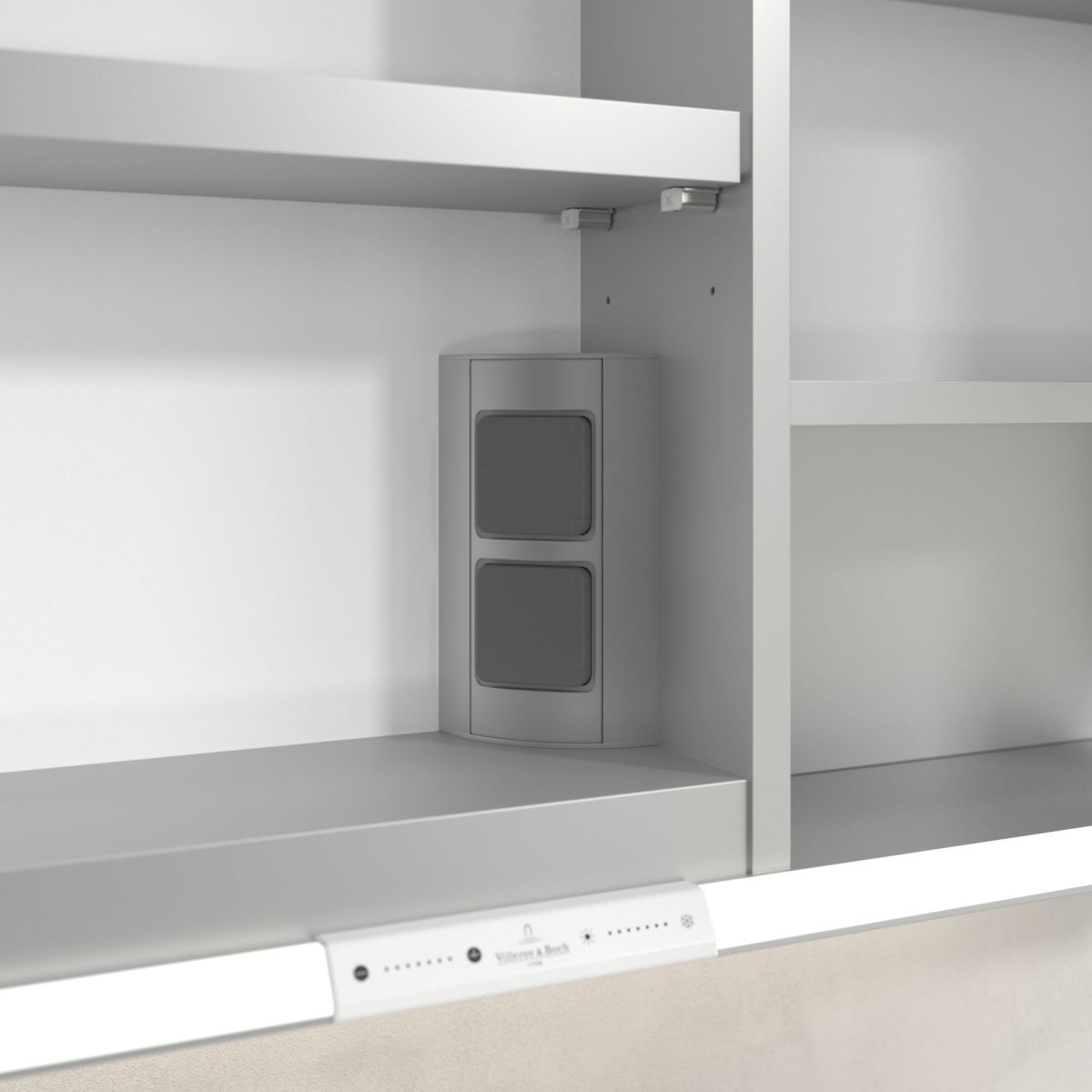 Das den Spiegel umgebende LED-Band sorgt für eine gleichmäßige Ausleuchtung, während die integrierte Waschtischbeleuchtung und die beleuchteten offenen Fächer eine stimmungsvolle Atmosphäre schaffen. Helligkeit und Farbtemperatur lassen sich bequem über einen Sensor oder eine Smart-Home-Steuerung regulieren. Dezente Griffe ermöglichen ein komfortables Öffnen der Türen ohne Fingerabdrücke, und eine doppelte Steckdose in der Mitte sorgt für zusätzliche Funktionalität.