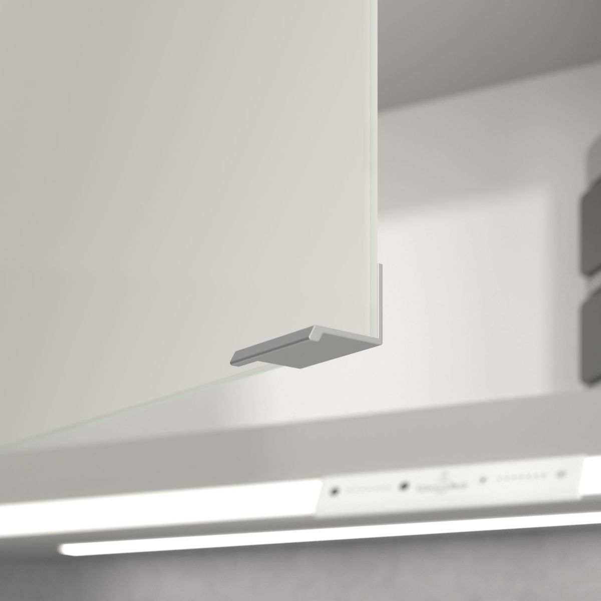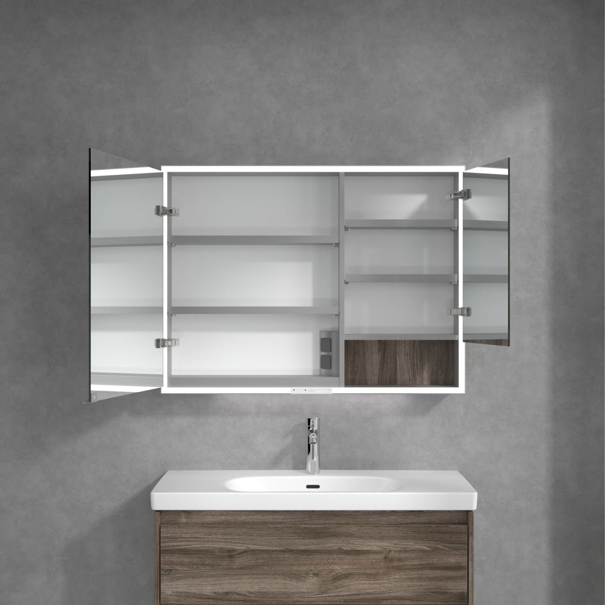 Das den Spiegel umgebende LED-Band sorgt für eine gleichmäßige Ausleuchtung, während die integrierte Waschtischbeleuchtung und die beleuchteten offenen Fächer eine stimmungsvolle Atmosphäre schaffen. Helligkeit und Farbtemperatur lassen sich bequem über einen Sensor oder eine Smart-Home-Steuerung regulieren. Dezente Griffe ermöglichen ein komfortables Öffnen der Türen ohne Fingerabdrücke, und eine doppelte Steckdose in der Mitte sorgt für zusätzliche Funktionalität.