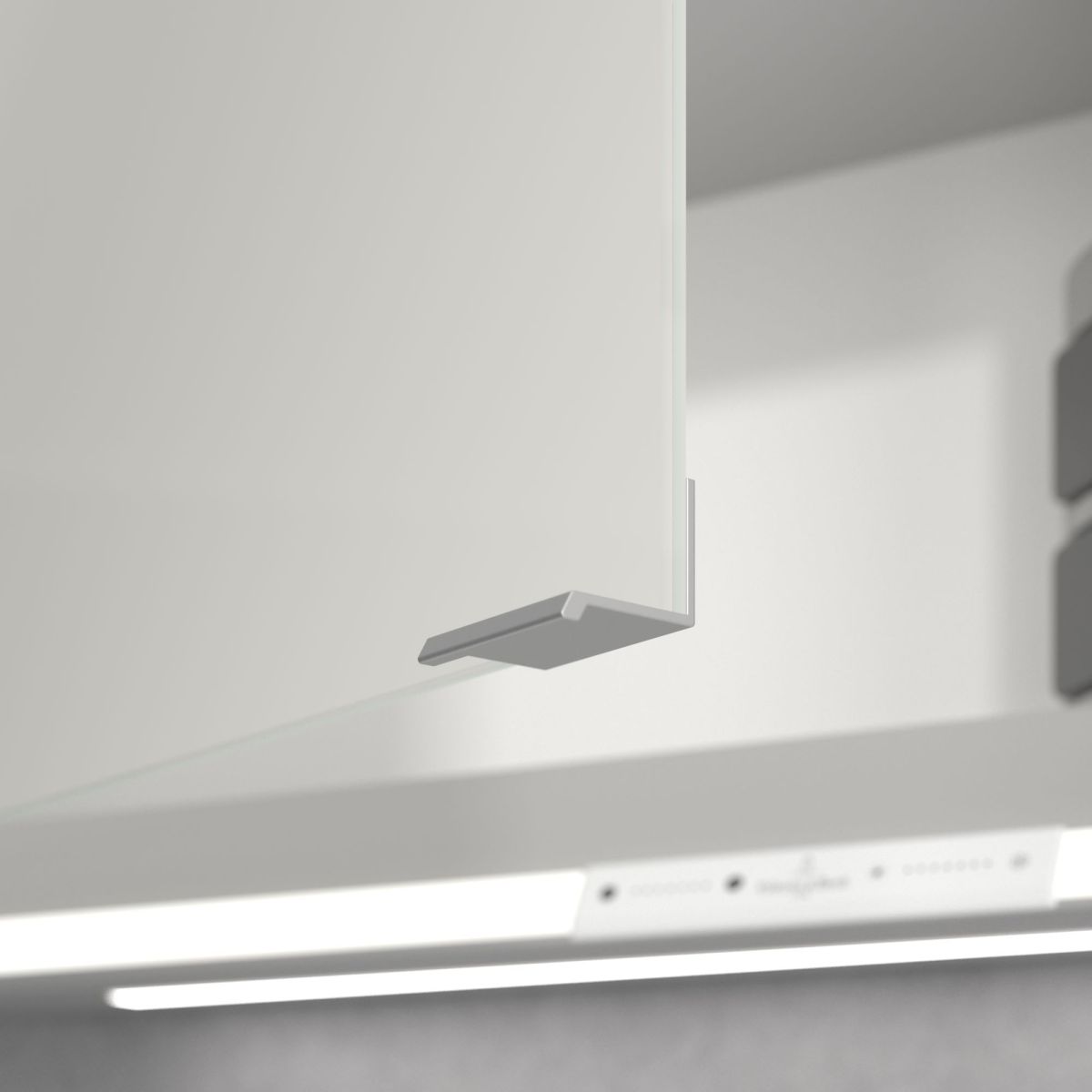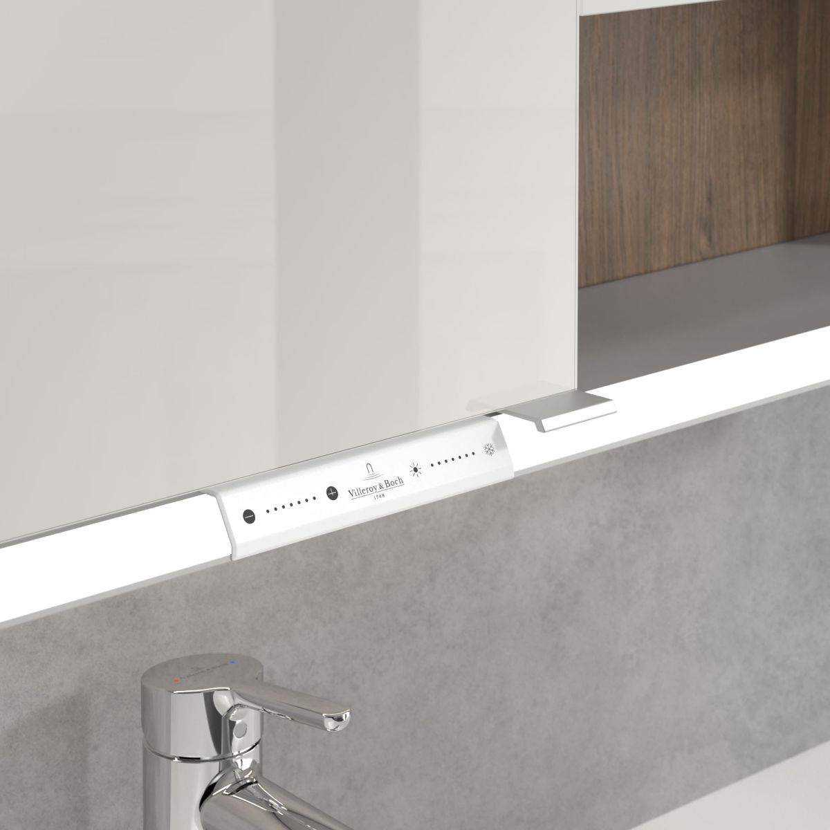 Das den Spiegel umgebende LED-Band sorgt für eine gleichmäßige Ausleuchtung, während die integrierte Waschtischbeleuchtung und die beleuchteten offenen Fächer eine stimmungsvolle Atmosphäre schaffen. Helligkeit und Farbtemperatur lassen sich bequem über einen Sensor oder eine Smart-Home-Steuerung regulieren. Dezente Griffe ermöglichen ein komfortables Öffnen der Türen ohne Fingerabdrücke, und eine doppelte Steckdose im Inneren sorgt für zusätzliche Funktionalität.