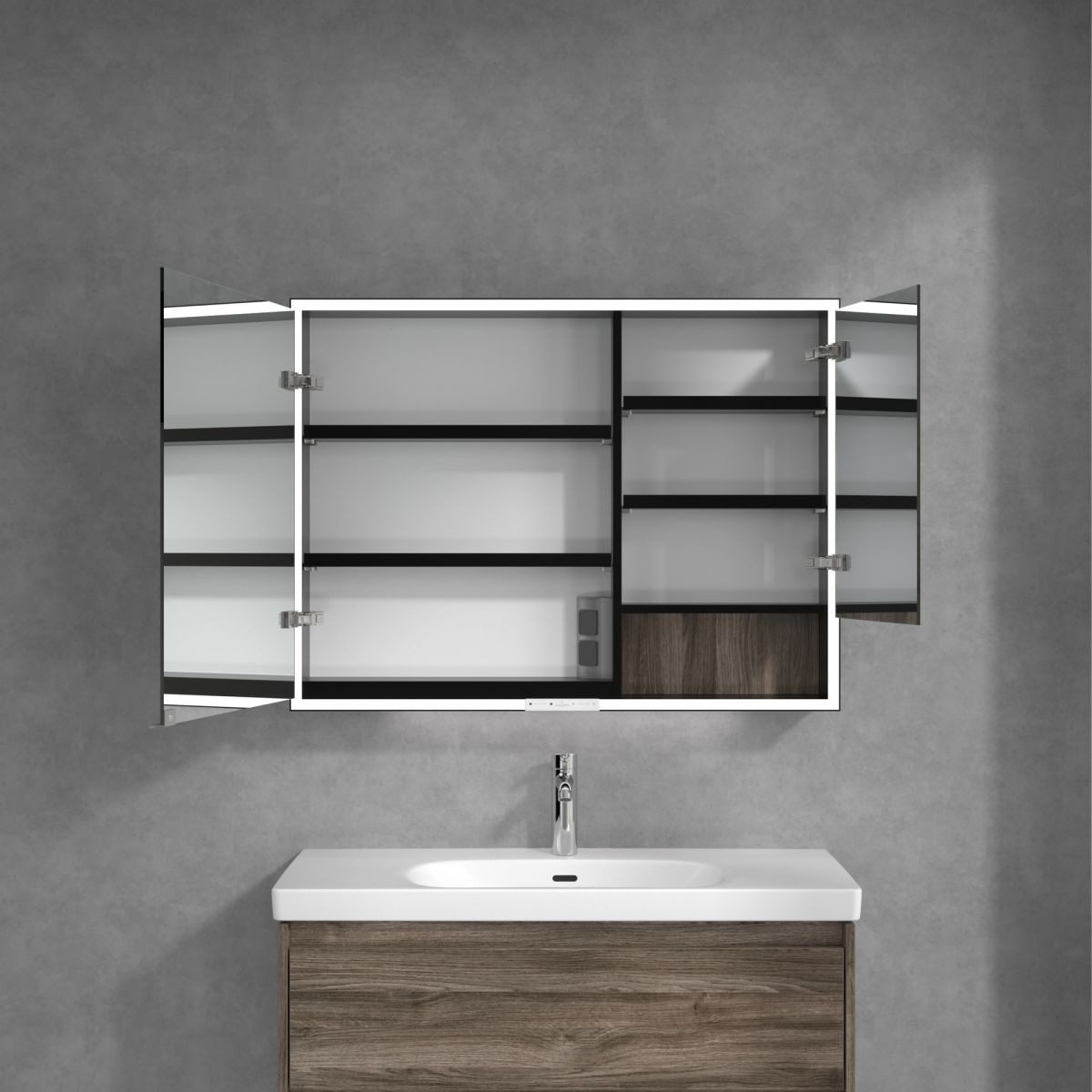 Das den Spiegel umgebende LED-Band sorgt für eine gleichmäßige Ausleuchtung, während die integrierte Waschtischbeleuchtung und die beleuchteten offenen Fächer eine stimmungsvolle Atmosphäre schaffen. Helligkeit und Farbtemperatur lassen sich bequem über einen Sensor oder eine Smart-Home-Steuerung regulieren. Die filigranen Griffe ermöglichen ein komfortables Öffnen der Türen ohne Fingerabdrücke, und die doppelte Steckdose im Inneren sorgt für zusätzliche Funktionalität.