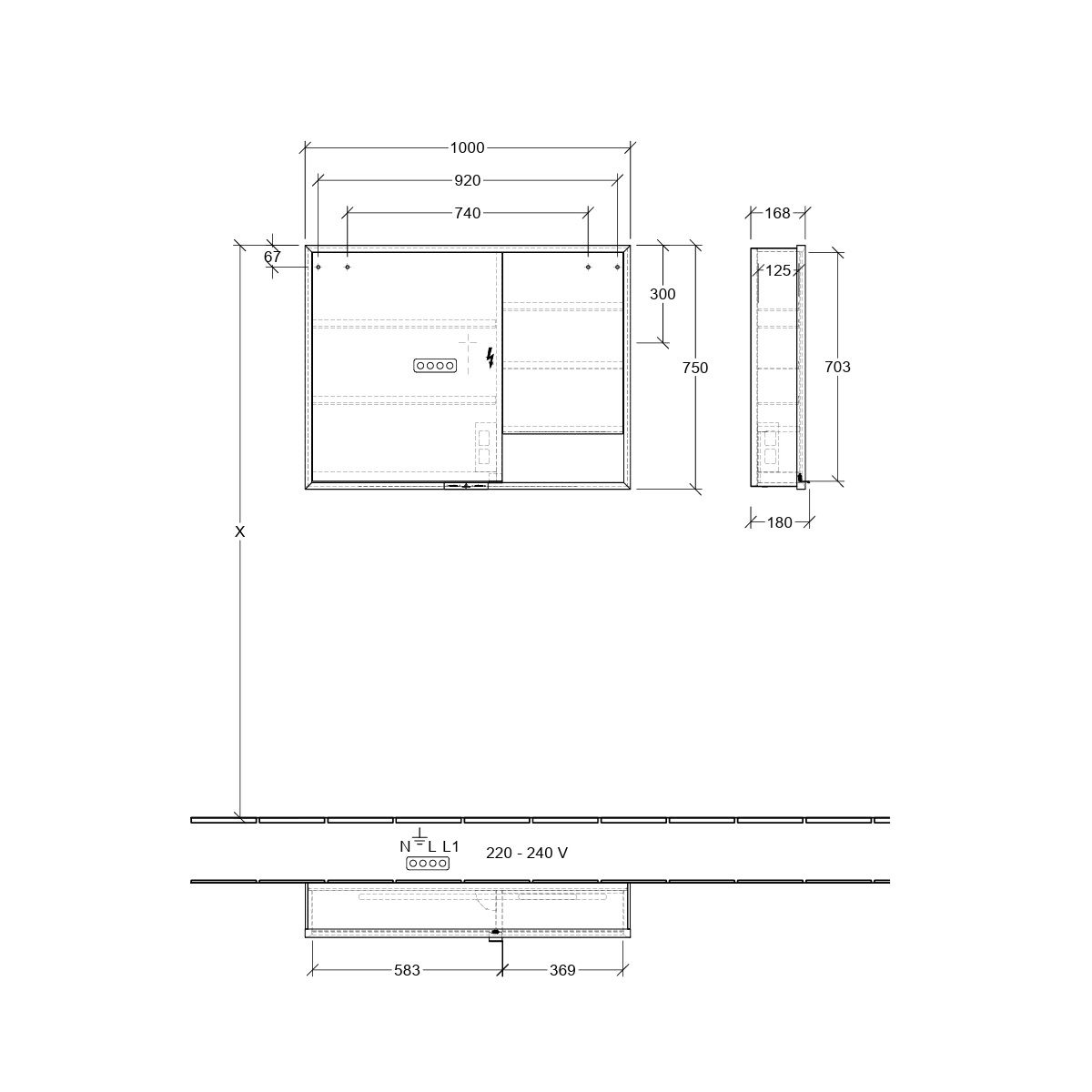 - Ausstattung: 2 x Türen, 1 x Sensorschalter außen, 2 x Steckdose innen, 4 x Ablagen aus Aluminium, 1 x offenes Fach rechts unten, 1 x Behälter, 1 x Vergrößerungsspiegel, 1 x Magnetleiste
