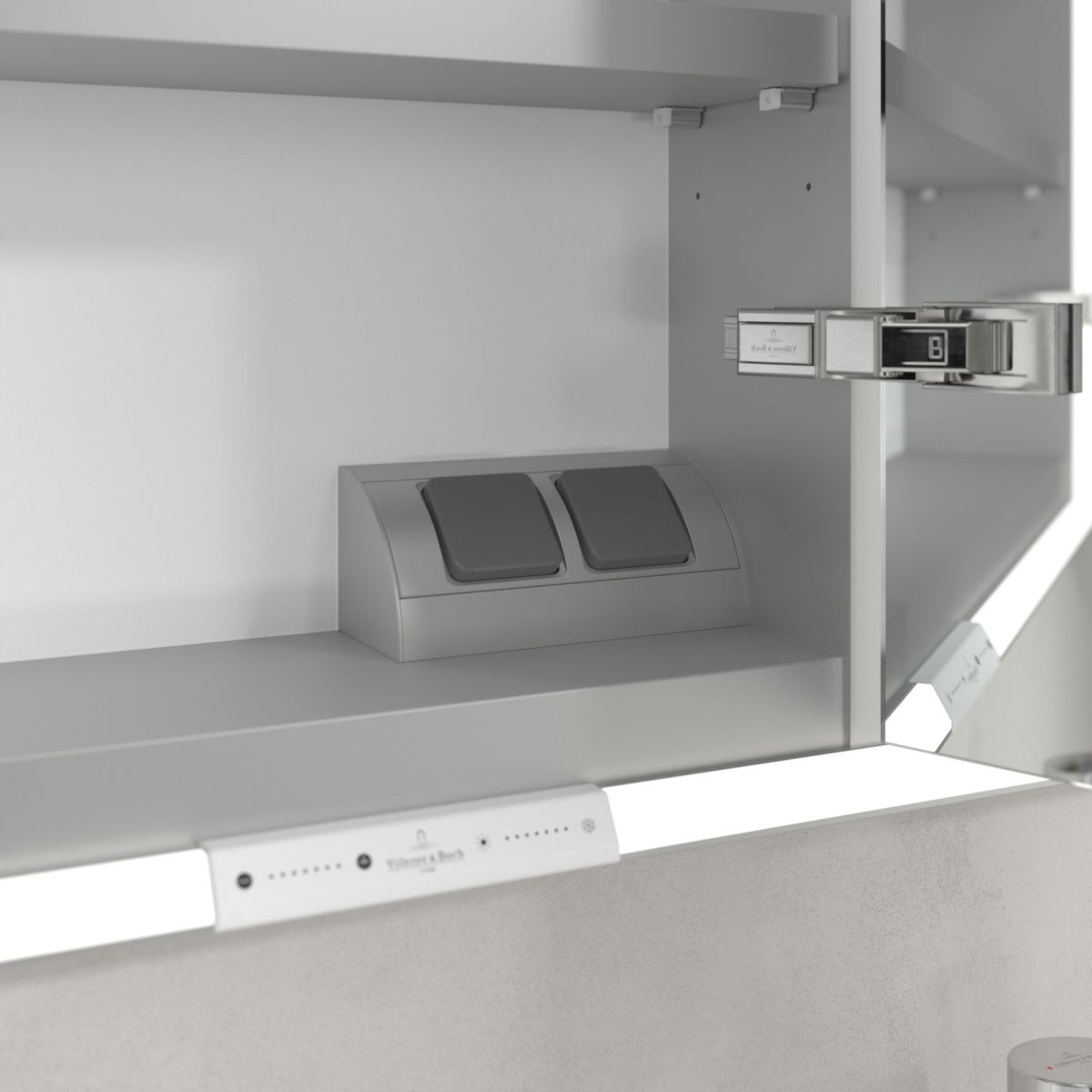 Das den Spiegel umgebende LED-Band sorgt für eine gleichmäßige Ausleuchtung, während die integrierte Waschtischbeleuchtung und die beleuchteten offenen Fächer eine stimmungsvolle Atmosphäre schaffen. Helligkeit und Farbtemperatur lassen sich bequem über einen Sensor oder eine Smart-Home-Steuerung regulieren. Dezente Griffe ermöglichen ein komfortables Öffnen der Türen ohne Fingerabdrücke, und eine doppelte Steckdose im Inneren sorgt für zusätzliche Funktionalität.
