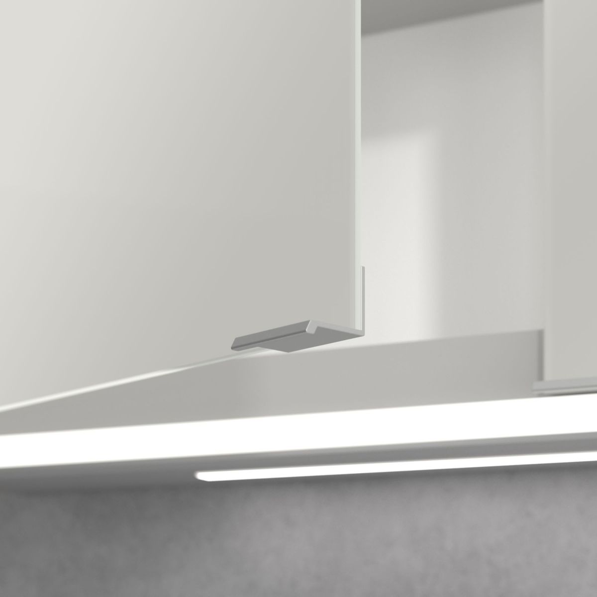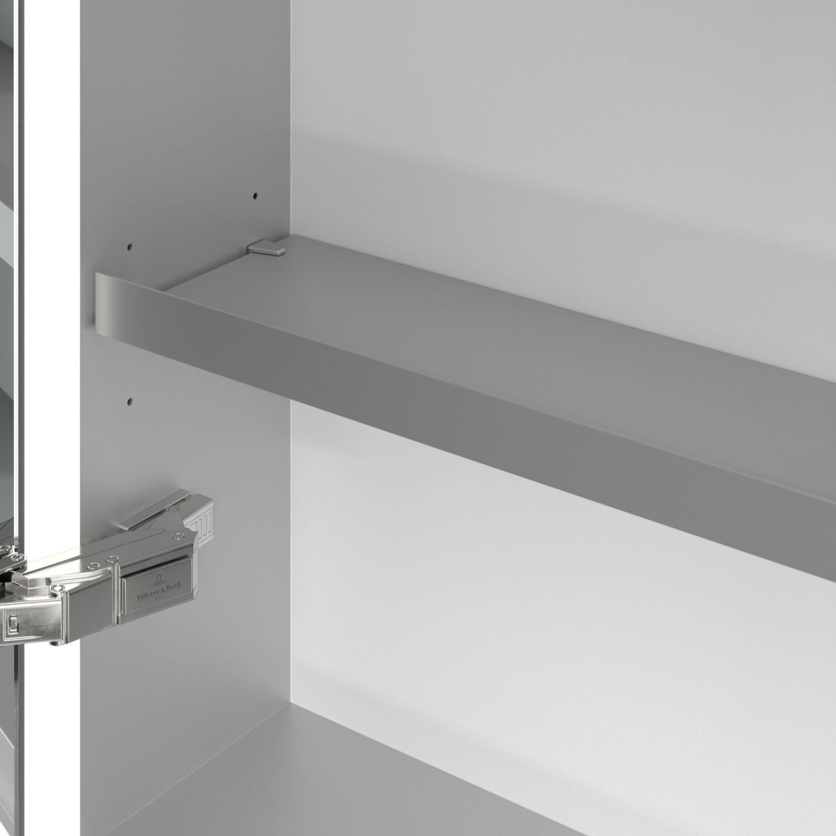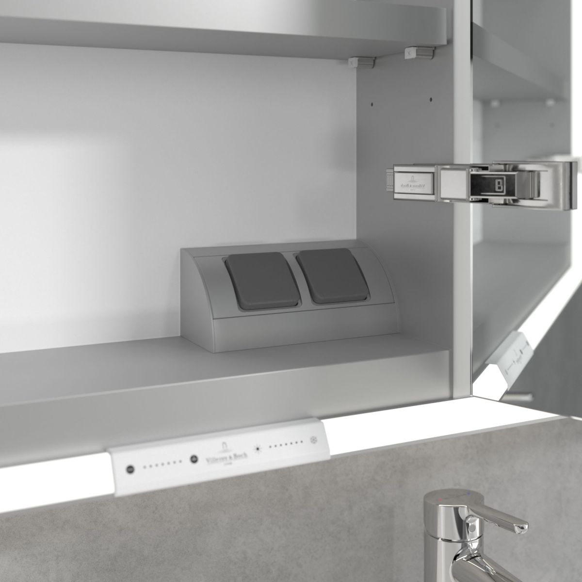 Das den Spiegel umgebende LED-Band sorgt für eine gleichmäßige Ausleuchtung, während die integrierte Waschtischbeleuchtung und die beleuchteten offenen Fächer eine stimmungsvolle Atmosphäre schaffen. Helligkeit und Farbtemperatur lassen sich bequem über einen Sensor oder eine Smart-Home-Steuerung regulieren. Dezente Griffe ermöglichen ein komfortables Öffnen der Türen ohne Fingerabdrücke, und eine doppelte Steckdose im Inneren sorgt für zusätzliche Funktionalität.