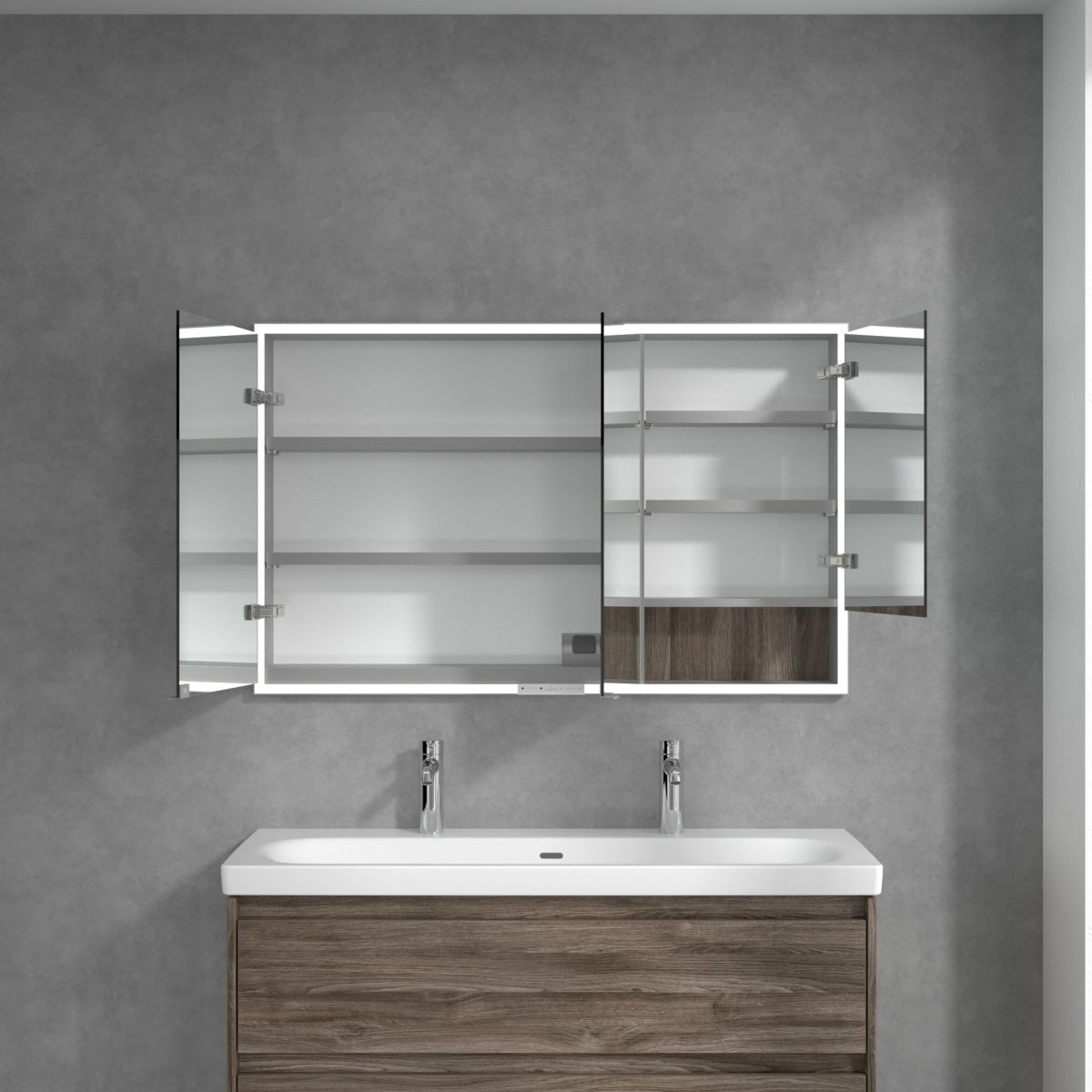 Das den Spiegel umgebende LED-Band sorgt für eine gleichmäßige Ausleuchtung, während die integrierte Waschtischbeleuchtung und die beleuchteten offenen Fächer eine stimmungsvolle Atmosphäre schaffen. Helligkeit und Farbtemperatur lassen sich bequem über einen Sensor oder eine Smart-Home-Steuerung regulieren. Dezente Griffe ermöglichen ein komfortables Öffnen der Türen ohne Fingerabdrücke, und eine doppelte Steckdose im Inneren sorgt für zusätzliche Funktionalität.