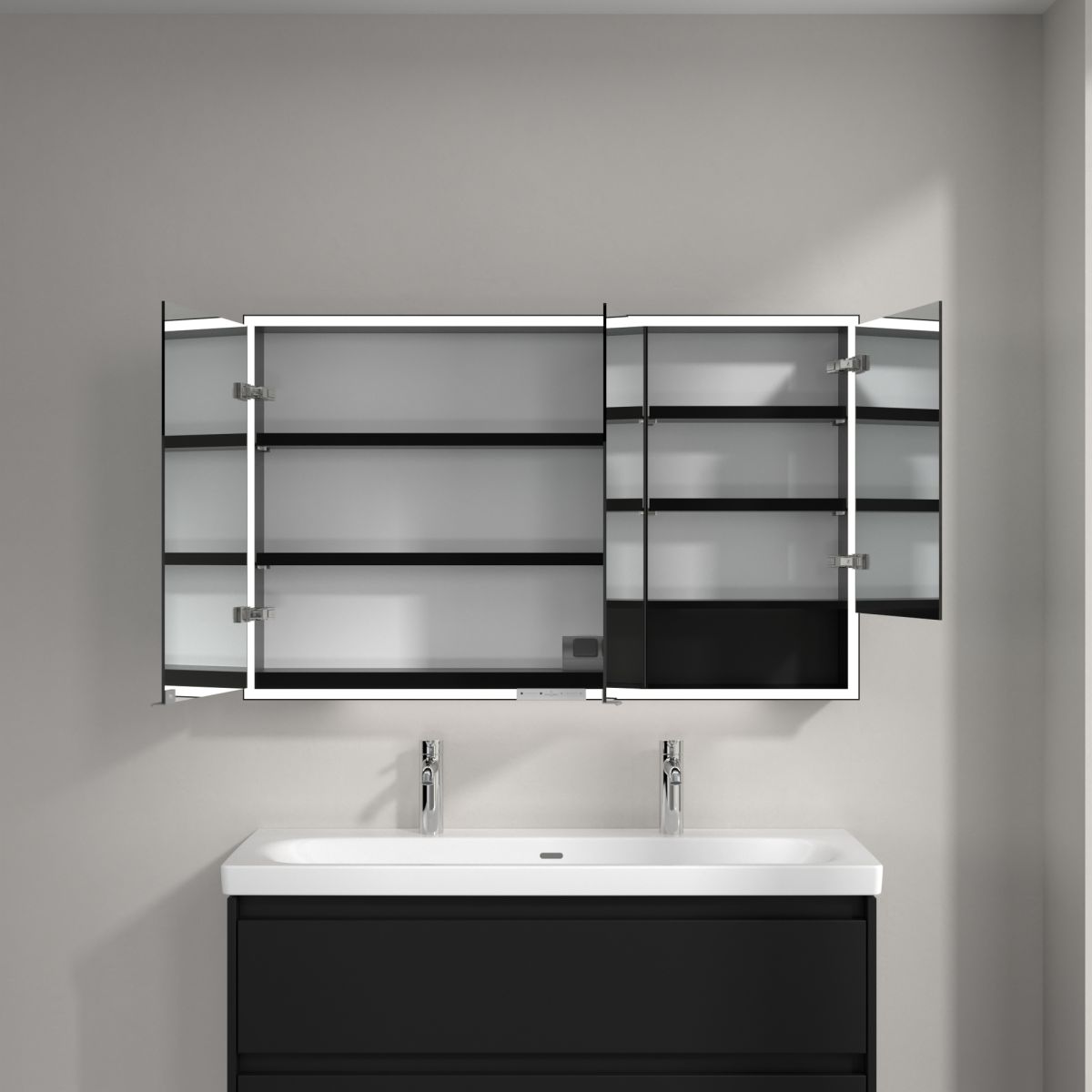 Das den Spiegel umgebende LED-Band sorgt für eine gleichmäßige Ausleuchtung, während die integrierte Waschtischbeleuchtung und die beleuchteten offenen Fächer eine stimmungsvolle Atmosphäre schaffen. Helligkeit und Farbtemperatur lassen sich bequem über einen Sensor oder eine Smart-Home-Steuerung regulieren. Die filigranen Griffe ermöglichen ein komfortables Öffnen der Türen ohne Fingerabdrücke, und die doppelte Steckdose im Inneren sorgt für zusätzliche Funktionalität.