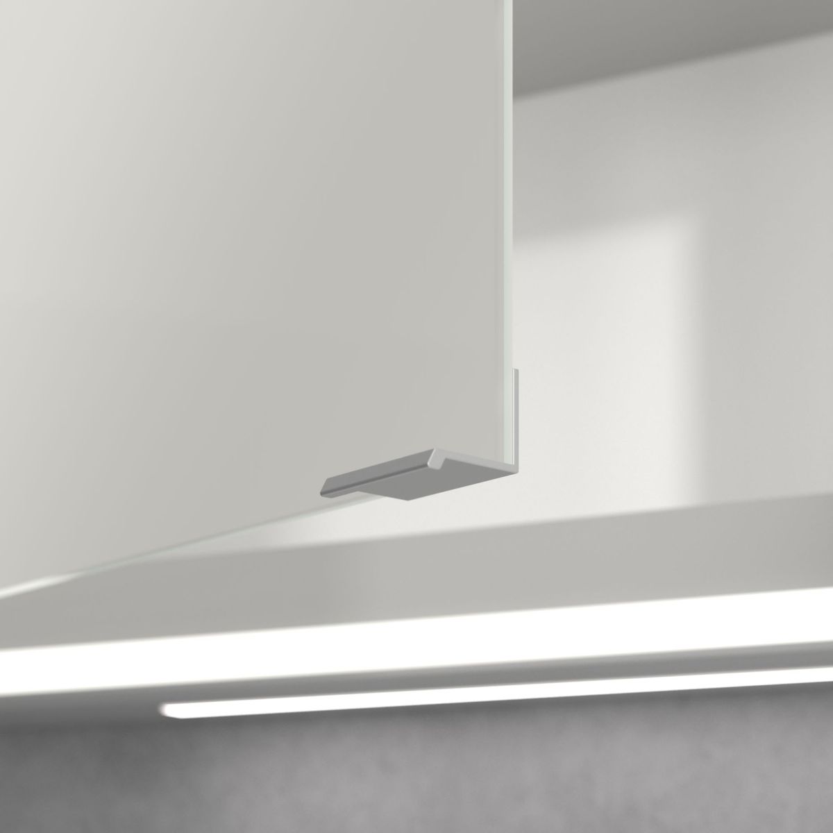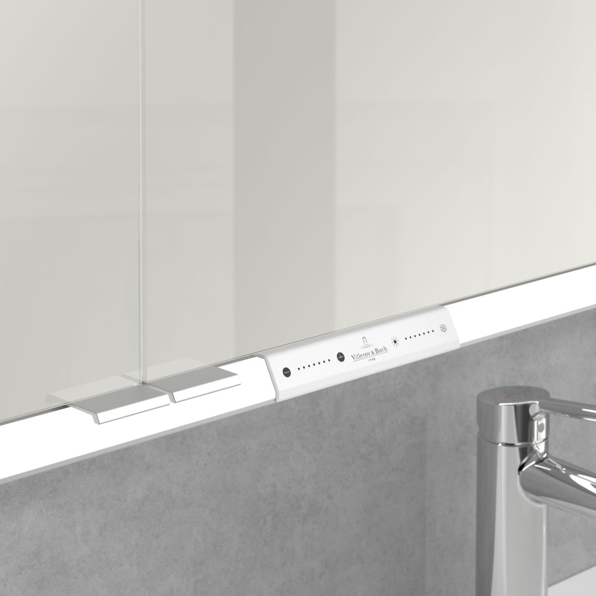 Das den Spiegel umgebende LED-Band sorgt für eine gleichmäßige Ausleuchtung, während die integrierte Waschtischbeleuchtung und die beleuchteten offenen Fächer eine stimmungsvolle Atmosphäre schaffen. Helligkeit und Farbtemperatur lassen sich bequem über einen Sensor oder eine Smart-Home-Steuerung regulieren. Dezente Griffe ermöglichen ein komfortables Öffnen der Türen ohne Fingerabdrücke, und eine doppelte Steckdose im Inneren sorgt für zusätzliche Funktionalität.