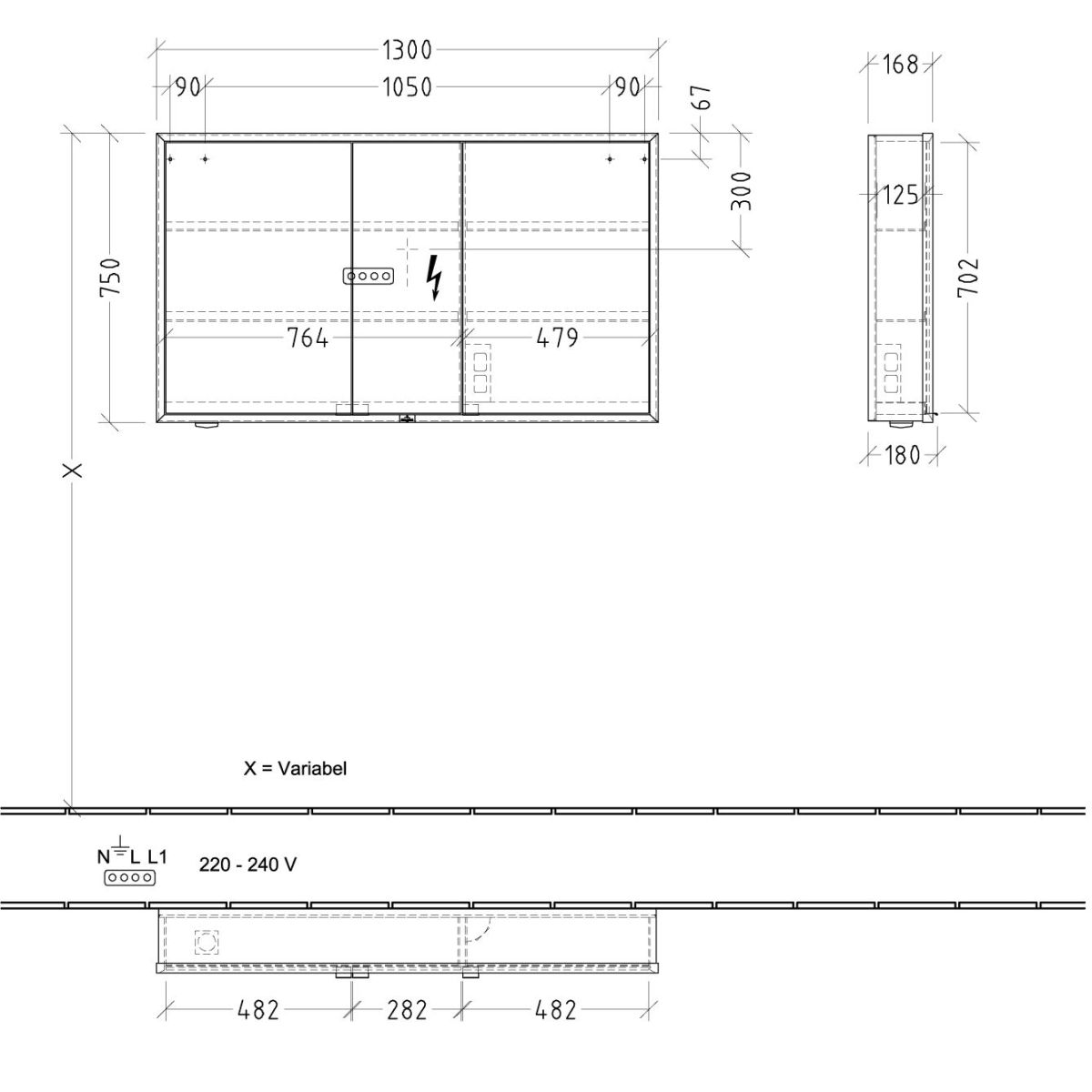 - Ausstattung: 3 x Türen, 1 x Sensorschalter außen, 2 x Steckdose innen, 4 x Aluminiumregale, 1 x offenes Fach rechts unten, 1 x Behälter, 1 x Vergrößerungsspiegel, 1 x Magnetleiste- Material des Korpus: Aluminium