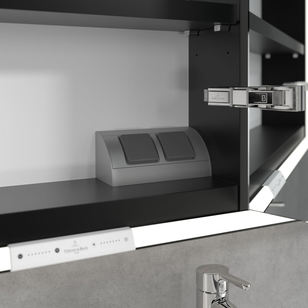 Das den Spiegel umgebende LED-Band sorgt für eine gleichmäßige Ausleuchtung, während die integrierte Waschtischbeleuchtung und die beleuchteten offenen Fächer eine stimmungsvolle Atmosphäre schaffen. Helligkeit und Farbtemperatur lassen sich bequem über einen Sensor oder eine Smart-Home-Steuerung regulieren. Die filigranen Griffe ermöglichen ein komfortables Öffnen der Türen ohne Fingerabdrücke, und die doppelte Steckdose im Inneren sorgt für zusätzliche Funktionalität.