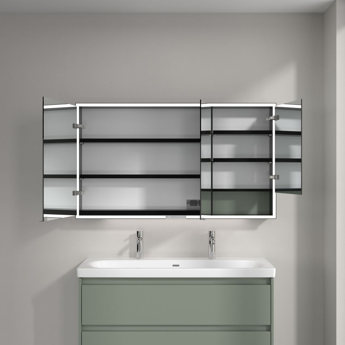 Das den Spiegel umgebende LED-Band sorgt für eine gleichmäßige Ausleuchtung, während die integrierte Waschtischbeleuchtung und die beleuchteten offenen Fächer eine stimmungsvolle Atmosphäre schaffen. Helligkeit und Farbtemperatur lassen sich bequem über einen Sensor oder einen Smart-Home-Controller einstellen. Die filigranen Griffe ermöglichen ein bequemes Öffnen der Türen ohne Fingerabdrücke, und die doppelte Steckdose im Inneren sorgt für zusätzliche Funktionalität.