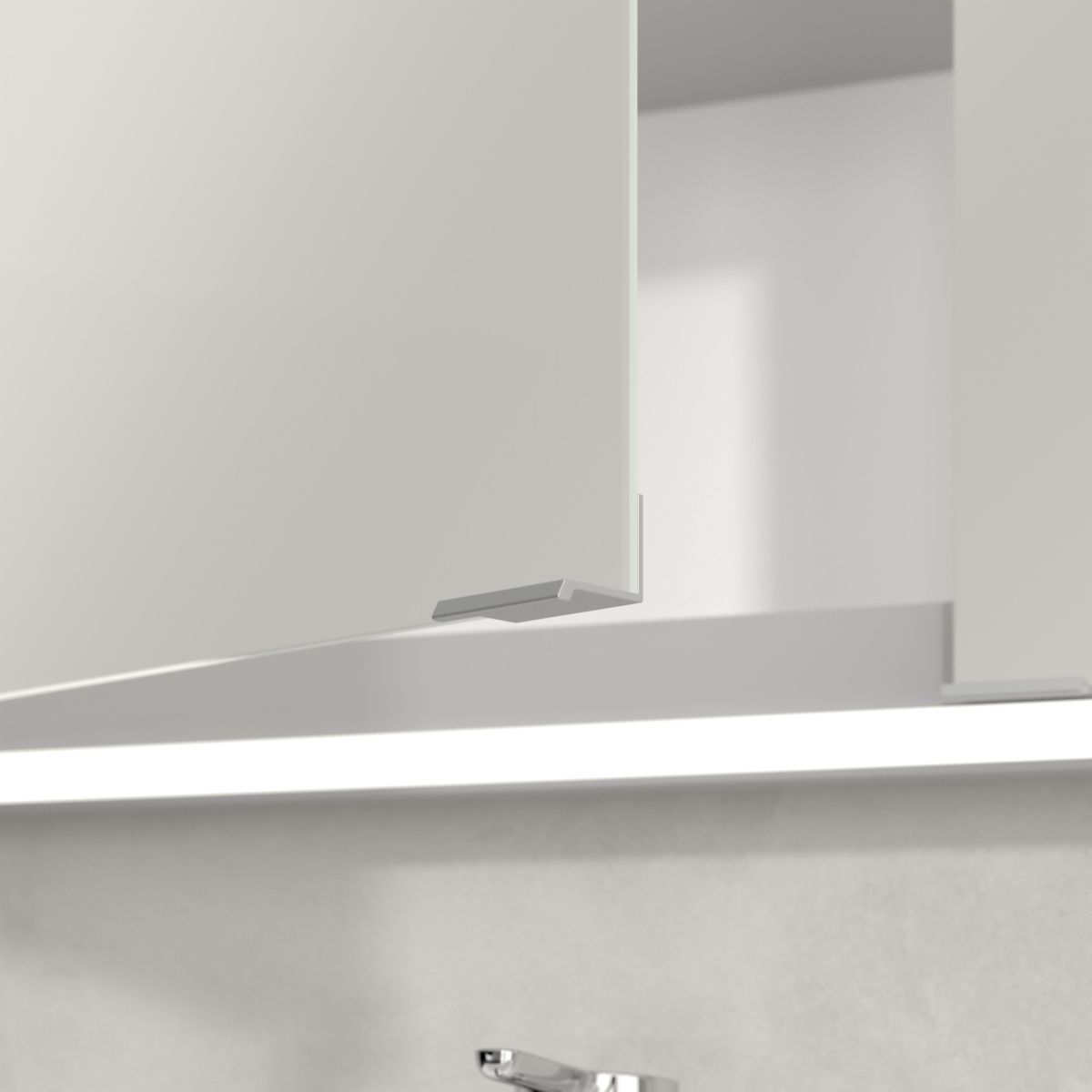 Das den Spiegel umgebende LED-Band sorgt für eine gleichmäßige Ausleuchtung, während die integrierte Waschtischbeleuchtung und die beleuchteten offenen Fächer eine stimmungsvolle Atmosphäre schaffen. Helligkeit und Farbtemperatur lassen sich bequem über einen Sensor oder eine Smart-Home-Steuerung regulieren. Die filigranen Griffe ermöglichen ein komfortables Öffnen der Türen ohne Fingerabdrücke, und die doppelte Steckdose im Inneren sorgt für zusätzliche Funktionalität.