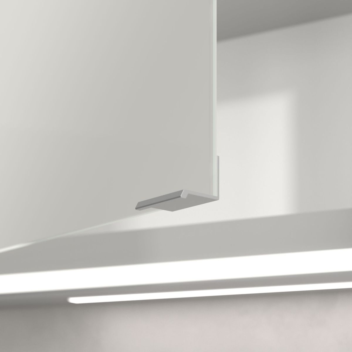 Das den Spiegel umgebende LED-Band sorgt für eine gleichmäßige Ausleuchtung, während die integrierte Waschtischbeleuchtung und die beleuchteten offenen Fächer eine stimmungsvolle Atmosphäre schaffen. Helligkeit und Farbtemperatur lassen sich bequem über einen Sensor oder eine Smart-Home-Steuerung regulieren. Dezente Griffe ermöglichen ein komfortables Öffnen der Türen ohne Fingerabdrücke, und eine doppelte Steckdose im Inneren sorgt für zusätzliche Funktionalität.