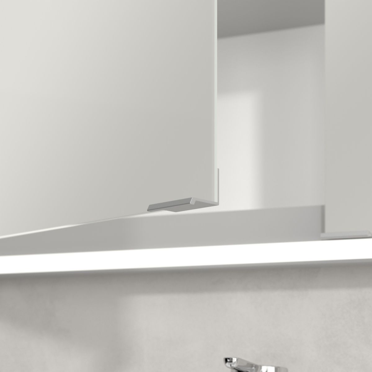 Das den Spiegel umgebende LED-Band sorgt für eine gleichmäßige Ausleuchtung, während die integrierte Waschtischbeleuchtung und die beleuchteten offenen Fächer eine stimmungsvolle Atmosphäre schaffen. Helligkeit und Farbtemperatur lassen sich bequem über einen Sensor oder eine Smart-Home-Steuerung regulieren. Die filigranen Griffe ermöglichen ein komfortables Öffnen der Türen ohne Fingerabdrücke, und die doppelte Steckdose im Inneren sorgt für zusätzliche Funktionalität.