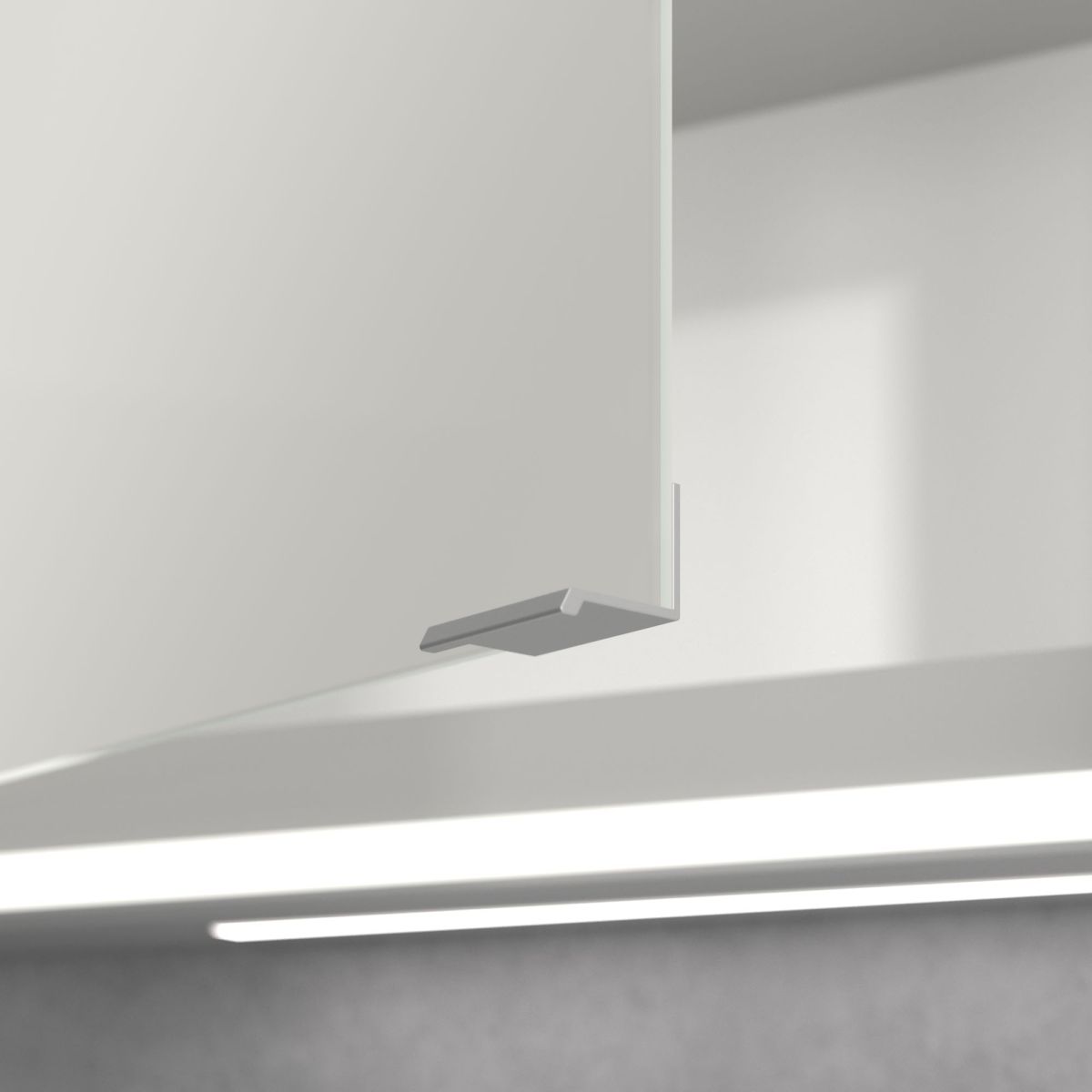 Das den Spiegel umgebende LED-Band sorgt für eine gleichmäßige Ausleuchtung, während die integrierte Waschtischbeleuchtung und die beleuchteten offenen Fächer eine stimmungsvolle Atmosphäre schaffen. Helligkeit und Farbtemperatur lassen sich bequem über einen Sensor oder eine Smart-Home-Steuerung regulieren. Dezente Griffe ermöglichen ein komfortables Öffnen der Türen ohne Fingerabdrücke, und eine doppelte Steckdose im Inneren sorgt für zusätzliche Funktionalität.