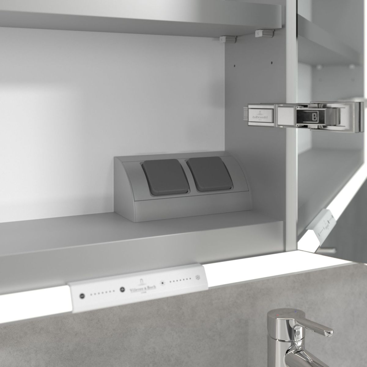 Das den Spiegel umgebende LED-Band sorgt für eine gleichmäßige Ausleuchtung, während die integrierte Waschtischbeleuchtung und die beleuchteten offenen Fächer eine stimmungsvolle Atmosphäre schaffen. Helligkeit und Farbtemperatur lassen sich bequem über einen Sensor oder eine Smart-Home-Steuerung regulieren. Dezente Griffe ermöglichen ein komfortables Öffnen der Türen ohne Fingerabdrücke, und eine doppelte Steckdose im Inneren sorgt für zusätzliche Funktionalität.