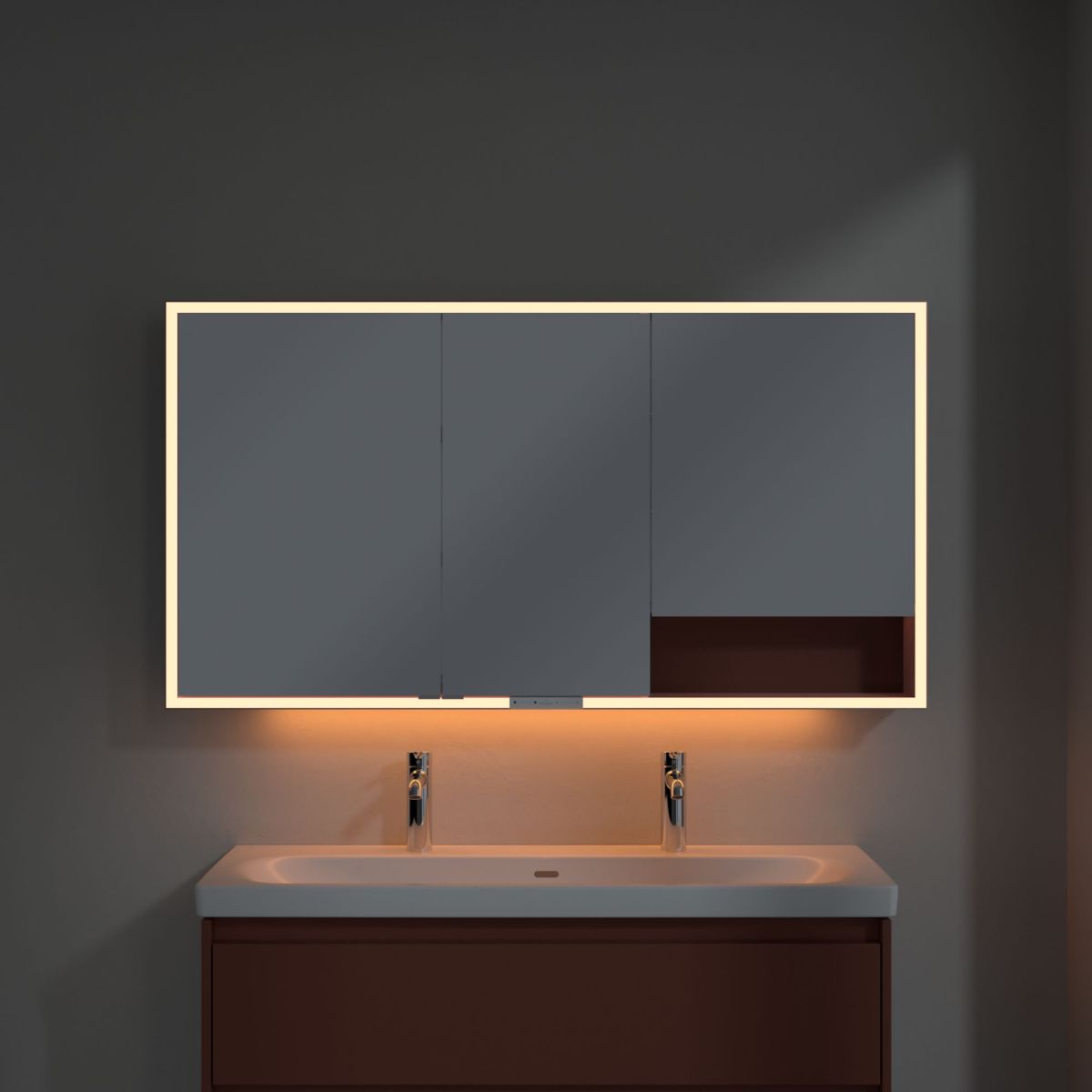 Das den Spiegel umgebende LED-Band sorgt für eine gleichmäßige Ausleuchtung, während die integrierte Waschtischbeleuchtung und die beleuchteten offenen Fächer eine stimmungsvolle Atmosphäre schaffen. Helligkeit und Farbtemperatur lassen sich bequem über einen Sensor oder eine Smart-Home-Steuerung regulieren. Dezente Griffe ermöglichen ein komfortables Öffnen der Türen ohne Fingerabdrücke, und eine doppelte Steckdose im Inneren sorgt für zusätzliche Funktionalität.