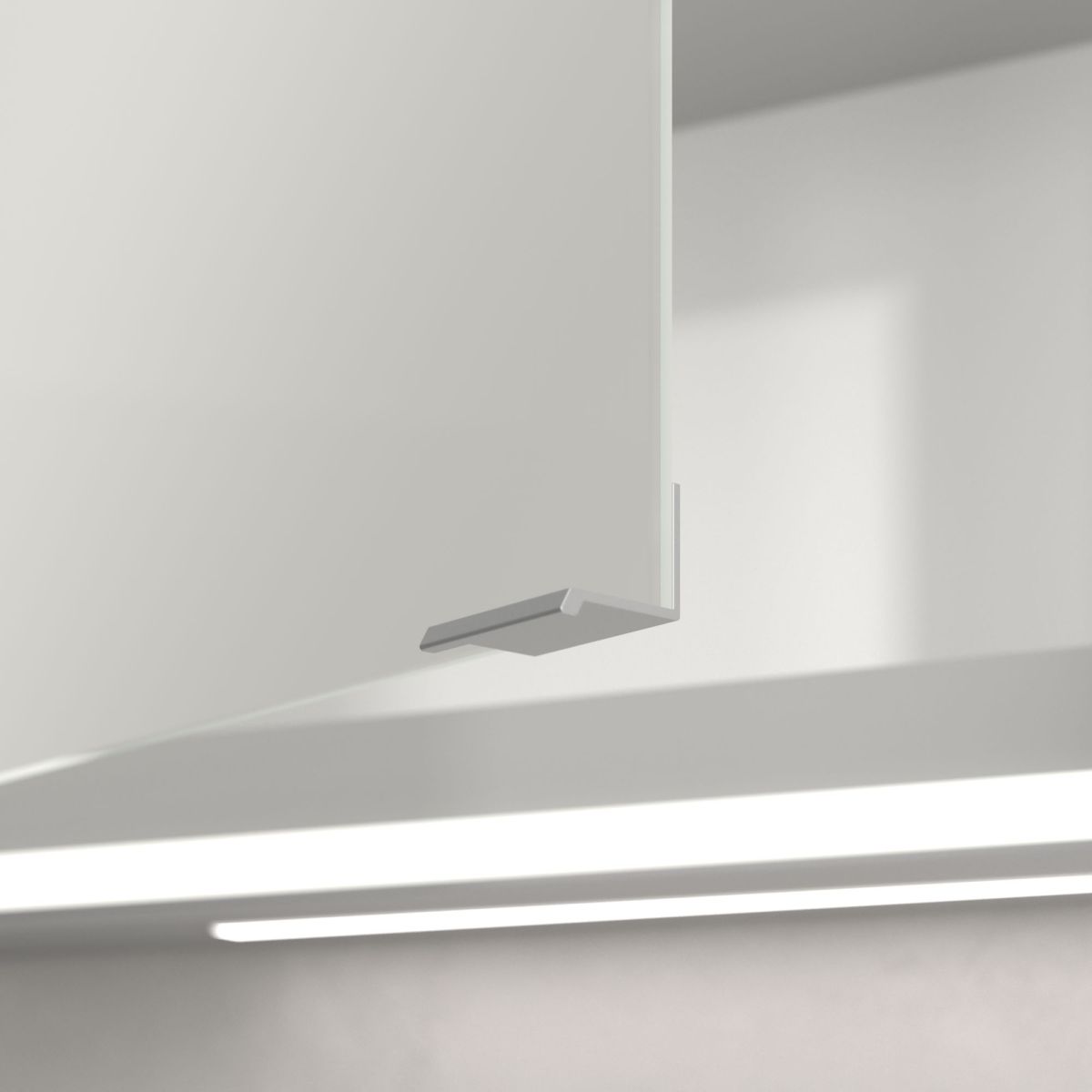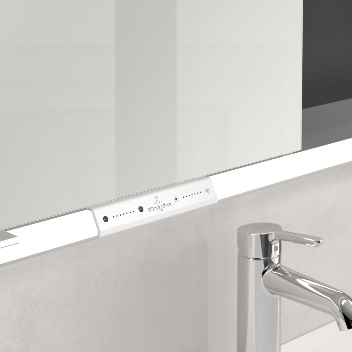 Das den Spiegel umgebende LED-Band sorgt für eine gleichmäßige Ausleuchtung, während die integrierte Waschtischbeleuchtung und die beleuchteten offenen Fächer eine stimmungsvolle Atmosphäre schaffen. Helligkeit und Farbtemperatur lassen sich bequem über einen Sensor oder eine Smart-Home-Steuerung regulieren. Dezente Griffe ermöglichen ein komfortables Öffnen der Türen ohne Fingerabdrücke, und eine doppelte Steckdose im Inneren sorgt für zusätzliche Funktionalität.