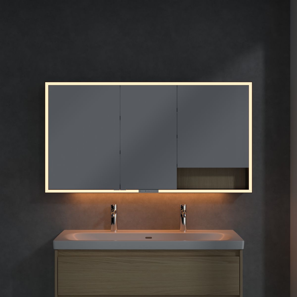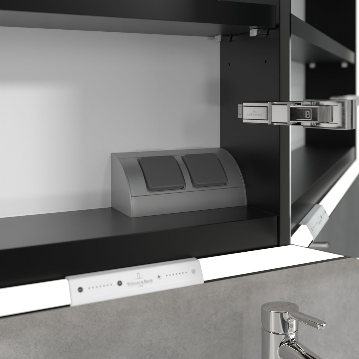 Das den Spiegel umgebende LED-Band sorgt für eine gleichmäßige Ausleuchtung, während die integrierte Waschtischbeleuchtung und die beleuchteten offenen Fächer eine stimmungsvolle Atmosphäre schaffen. Helligkeit und Farbtemperatur lassen sich bequem über einen Sensor oder eine Smart-Home-Steuerung regulieren. Dezente Griffe ermöglichen ein komfortables Öffnen der Türen ohne Fingerabdrücke, und eine doppelte Steckdose in der Mitte sorgt für zusätzliche Funktionalität.