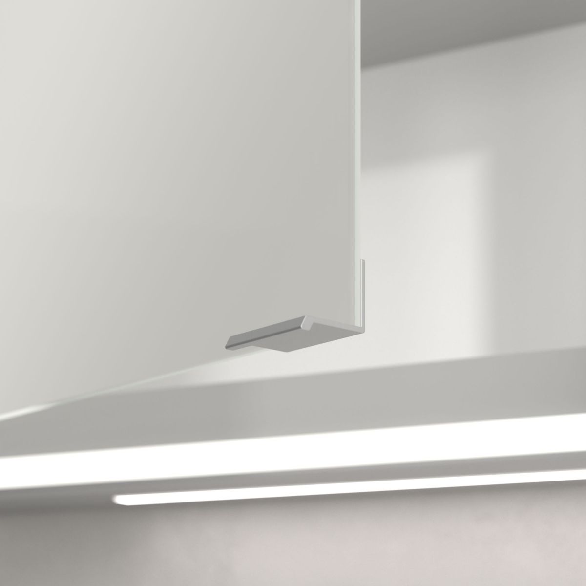 Das den Spiegel umgebende LED-Band sorgt für eine gleichmäßige Ausleuchtung, während die integrierte Waschtischbeleuchtung und die beleuchteten offenen Fächer eine stimmungsvolle Atmosphäre schaffen. Helligkeit und Farbtemperatur lassen sich bequem über einen Sensor oder eine Smart-Home-Steuerung regulieren. Dezente Griffe ermöglichen ein komfortables Öffnen der Türen ohne Fingerabdrücke, und eine doppelte Steckdose im Inneren sorgt für zusätzliche Funktionalität.