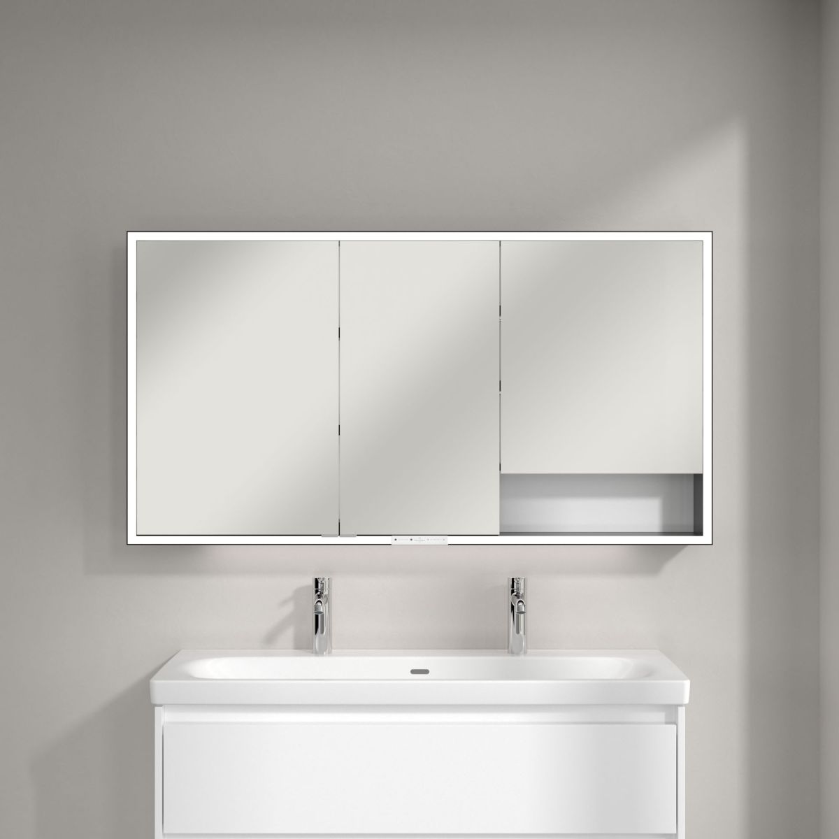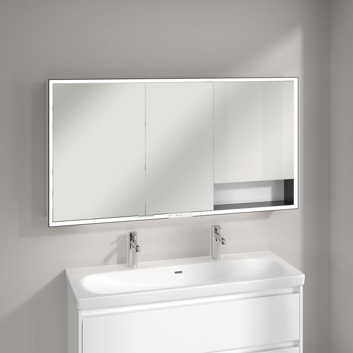 Eine raffinierte und attraktive Lösung für das minimalistische Badezimmer – der Einbau-Spiegelschrank My View+ von Villeroy & Boch setzt mit intelligenten Funktionen und stilvollen Farbakzenten neue Maßstäbe. Der Schrank mit geschlossenen Fächern und offenen Kammern fügt sich perfekt in die Wand ein und sorgt für einen besonders eleganten, minimalistischen Effekt. Die farbige Rückwand setzt individuelle Farbakzente und Designelemente im Badezimmer.