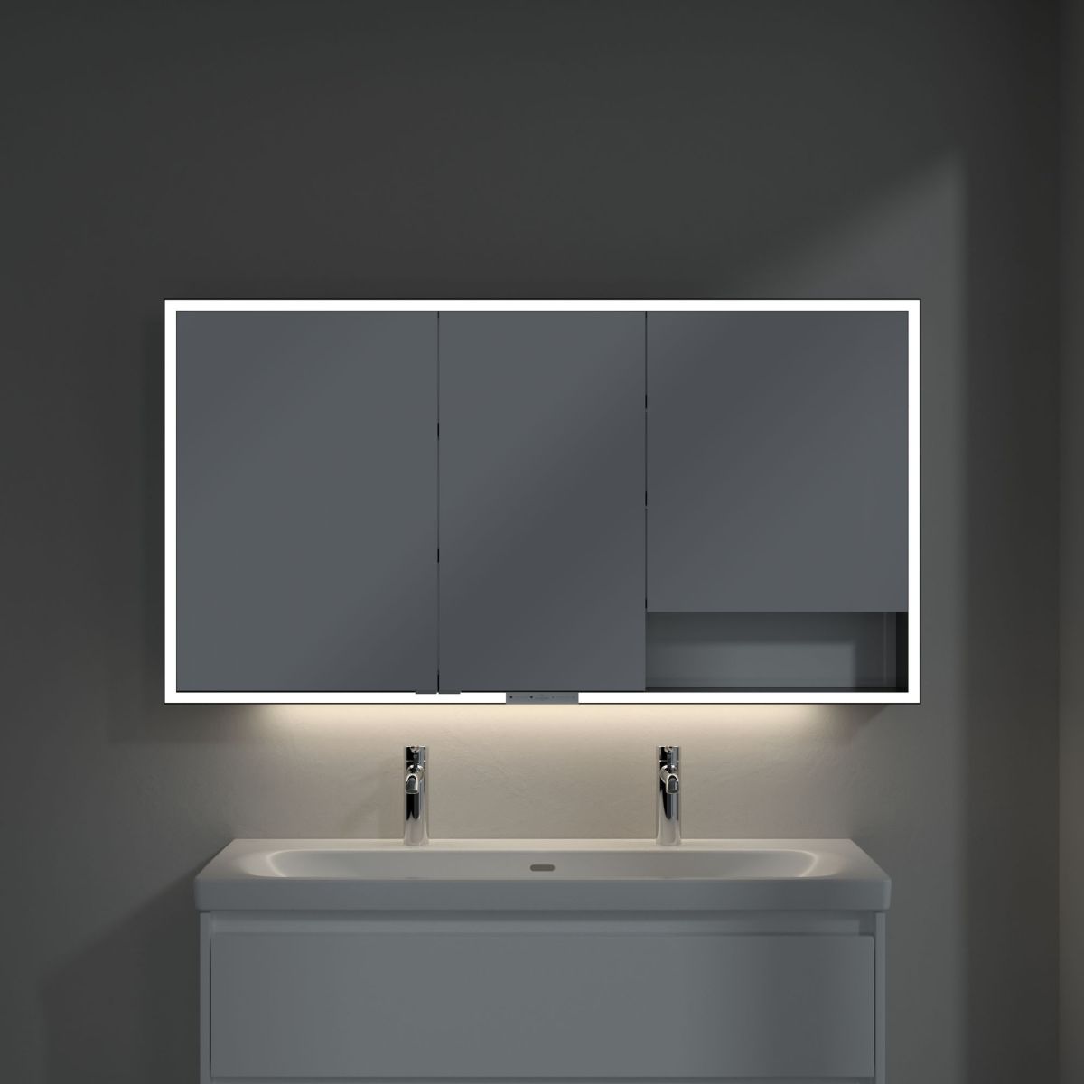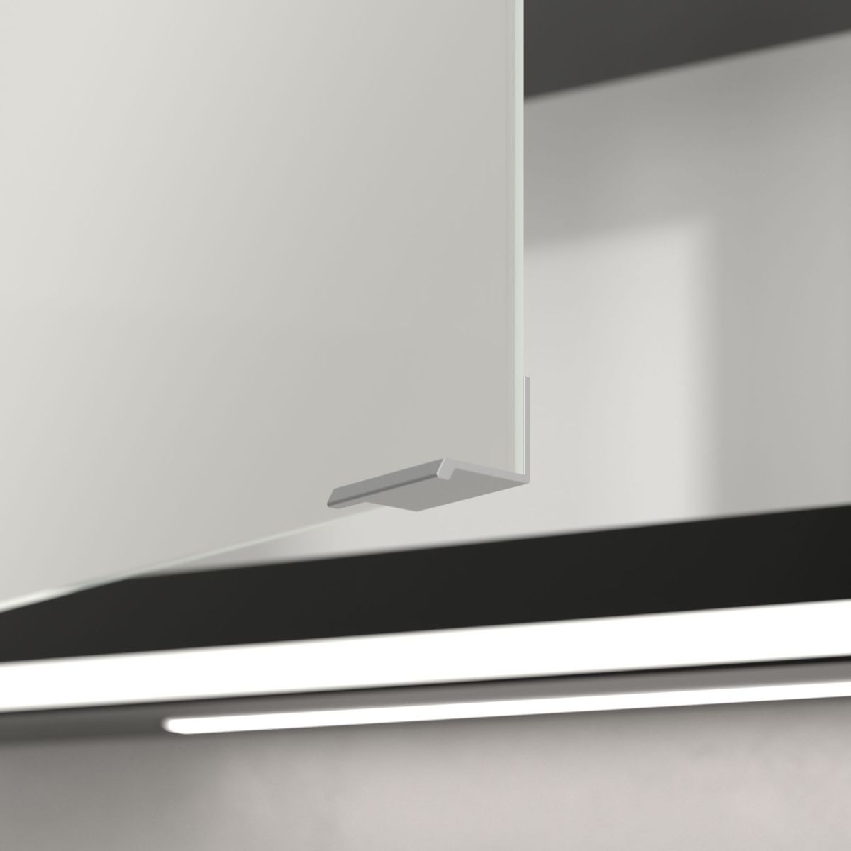Das den Spiegel umgebende LED-Band sorgt für eine gleichmäßige Ausleuchtung, während die integrierte Waschtischbeleuchtung und die beleuchteten offenen Fächer eine stimmungsvolle Atmosphäre schaffen. Helligkeit und Farbtemperatur lassen sich bequem über einen Sensor oder eine Smart-Home-Steuerung regulieren. Dezente Griffe ermöglichen ein komfortables Öffnen der Türen ohne Fingerabdrücke, und eine doppelte Steckdose in der Mitte sorgt für zusätzliche Funktionalität.