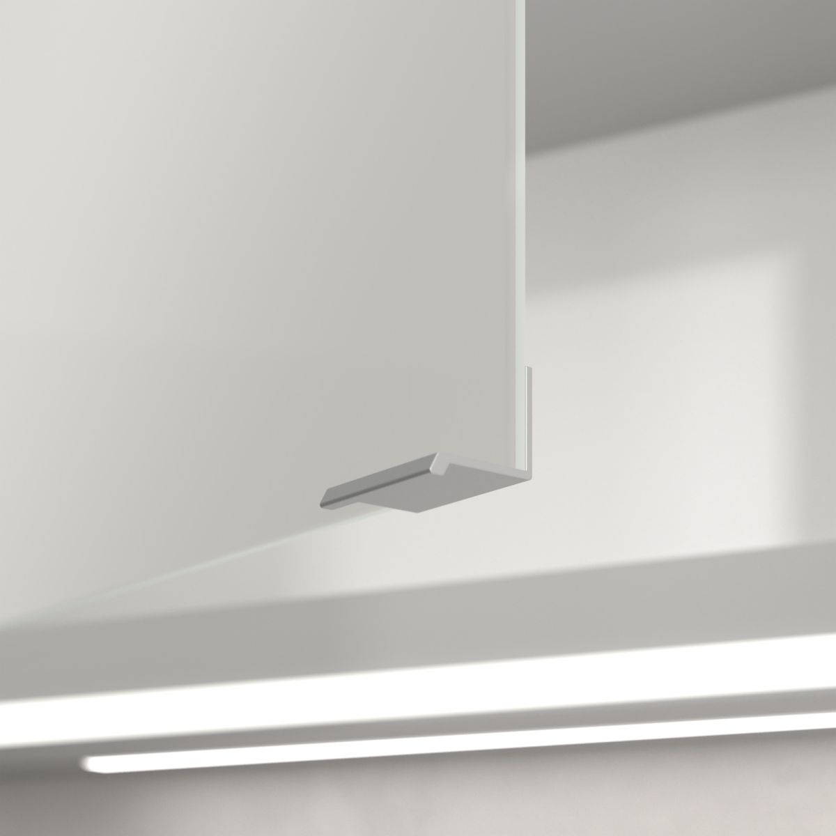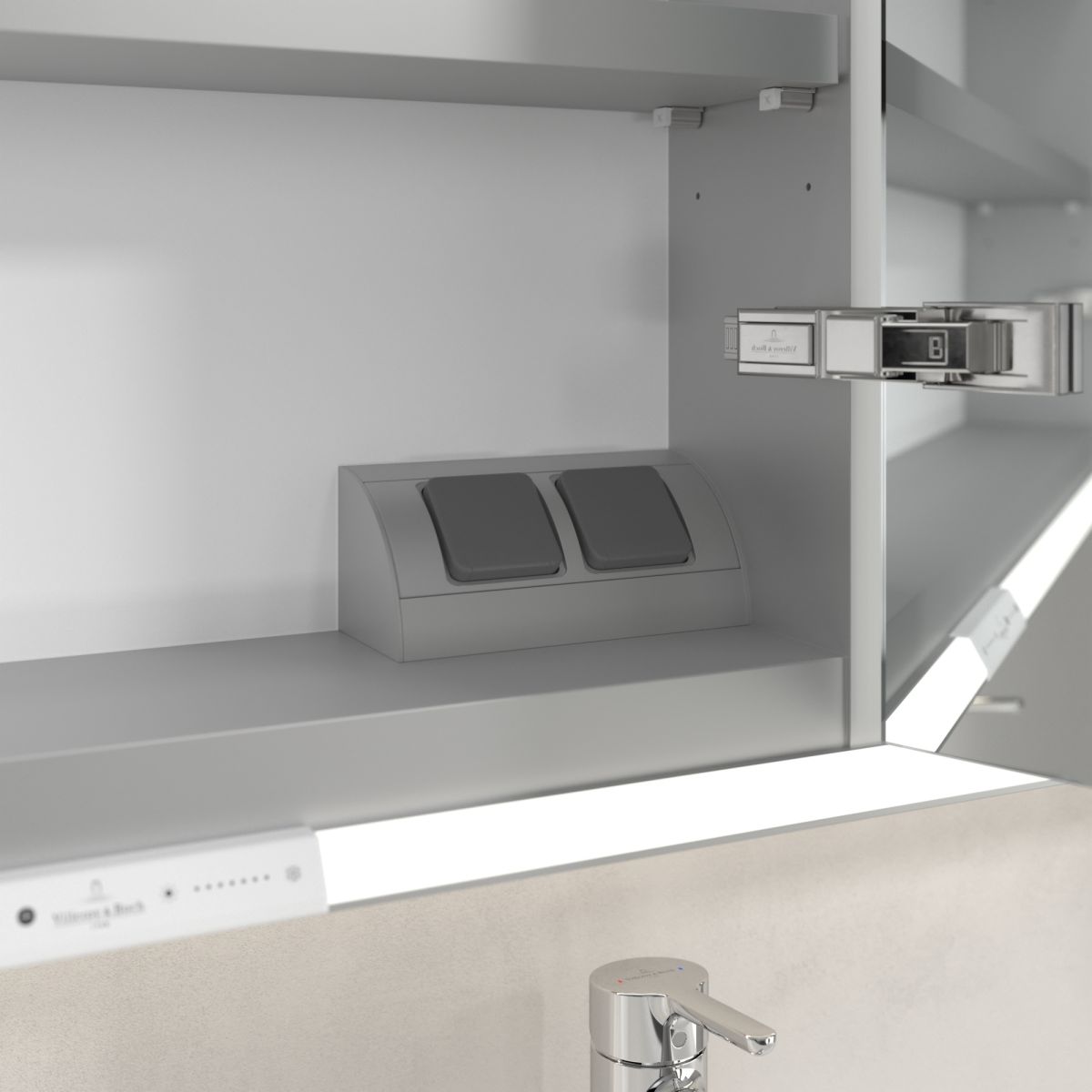 Das den Spiegel umgebende LED-Band sorgt für eine gleichmäßige Ausleuchtung, während die integrierte Waschtischbeleuchtung und die beleuchteten offenen Fächer eine stimmungsvolle Atmosphäre schaffen. Helligkeit und Farbtemperatur lassen sich bequem über einen Sensor oder einen Smart-Home-Controller einstellen. Die filigranen Griffe ermöglichen ein bequemes Öffnen der Türen ohne Fingerabdrücke, und die doppelte Steckdose im Inneren sorgt für zusätzliche Funktionalität.