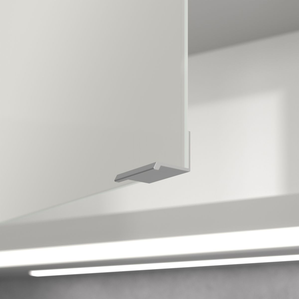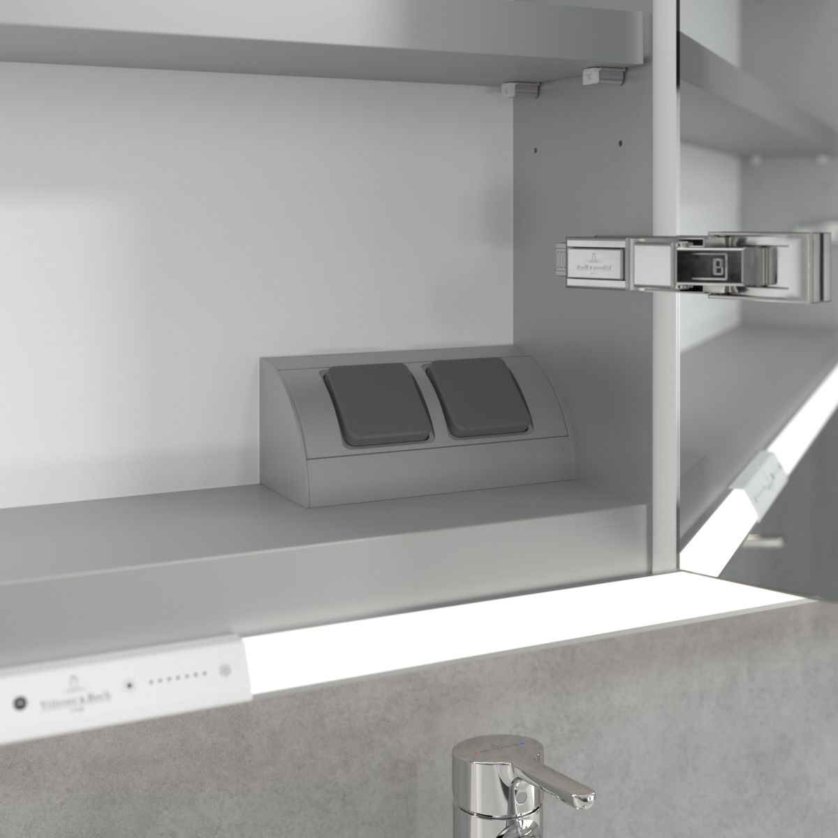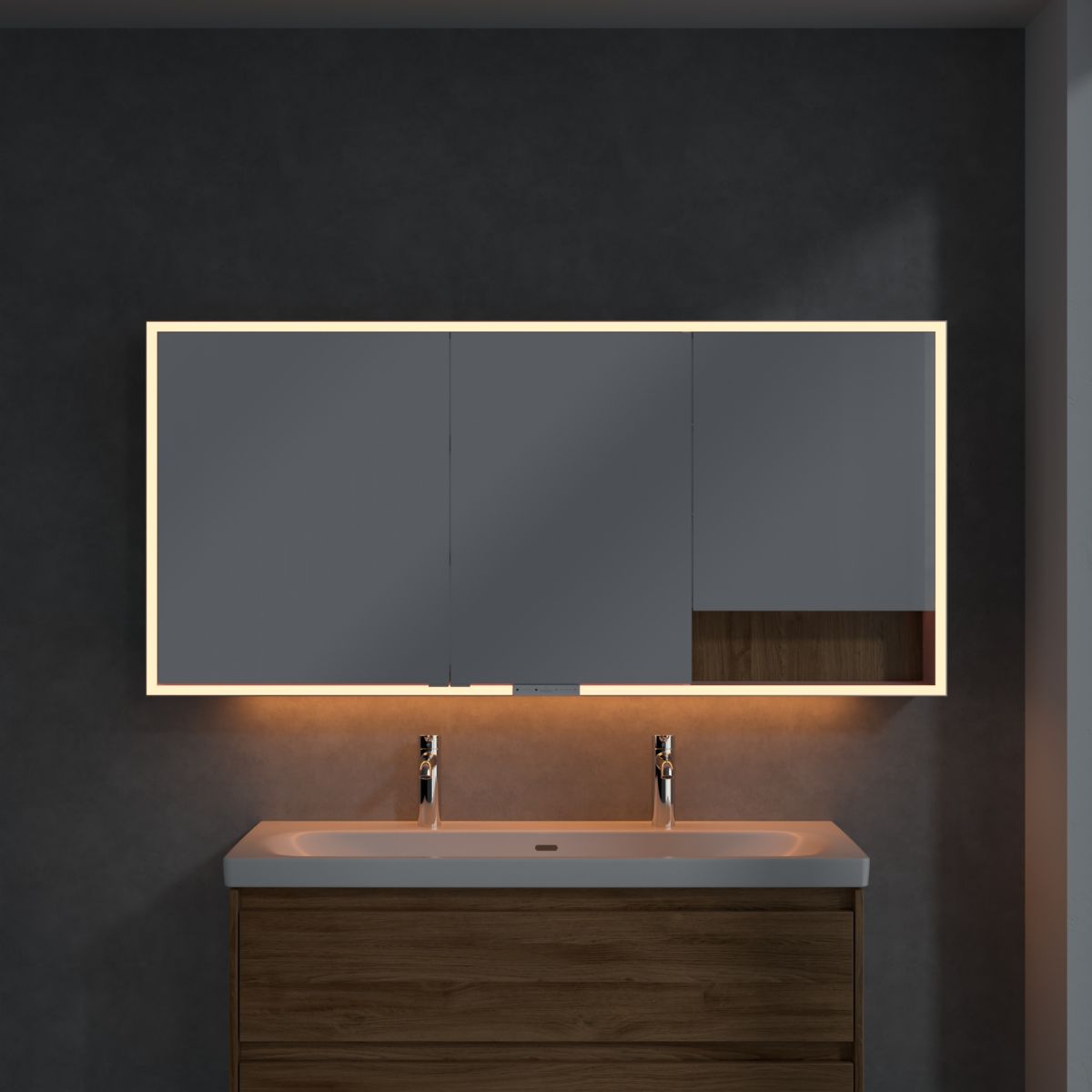 Das den Spiegel umgebende LED-Band sorgt für eine gleichmäßige Ausleuchtung, während die integrierte Waschtischbeleuchtung und die beleuchteten offenen Fächer eine stimmungsvolle Atmosphäre schaffen. Helligkeit und Farbtemperatur lassen sich bequem über einen Sensor oder eine Smart-Home-Steuerung regulieren. Die filigranen Griffe ermöglichen ein bequemes Öffnen der Türen ohne Fingerabdrücke, und die doppelte Steckdose im Inneren sorgt für zusätzliche Funktionalität.