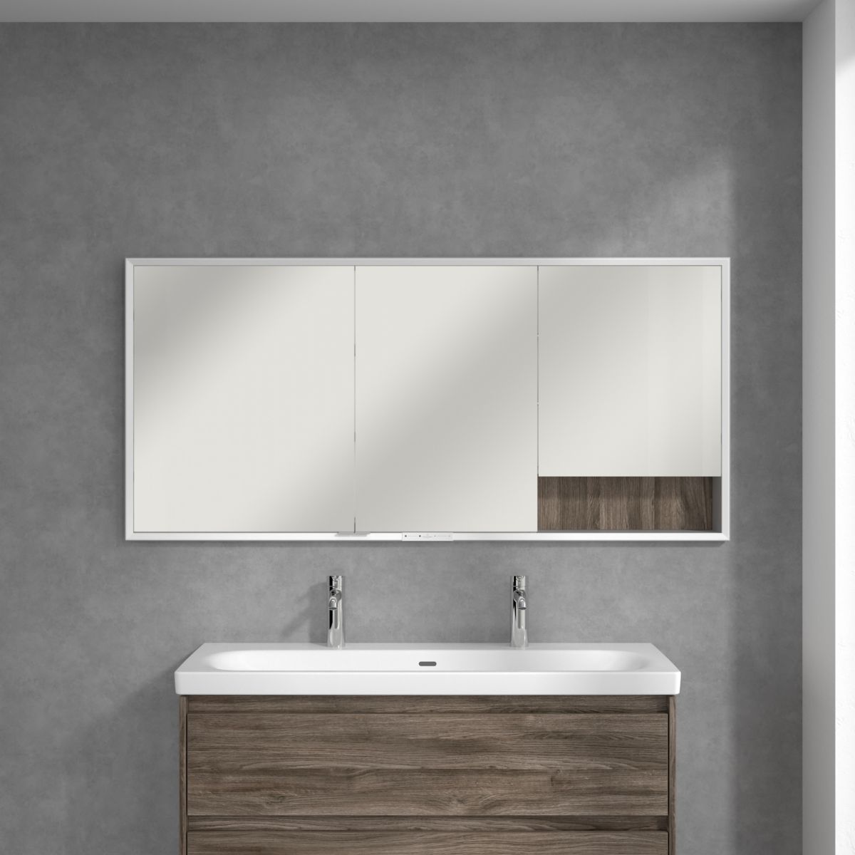 Eine raffinierte und attraktive Lösung für das minimalistische Badezimmer – der Einbau-Spiegelschrank My View+ von Villeroy & Boch setzt mit intelligenten Funktionen und stilvollen Farbakzenten neue Maßstäbe. Der Schrank mit geschlossenen Fächern und offenen Kammern fügt sich perfekt in die Wand ein und sorgt für einen besonders eleganten, minimalistischen Effekt. Die farbige Rückwand setzt individuelle Farbakzente und Designelemente im Badezimmer.