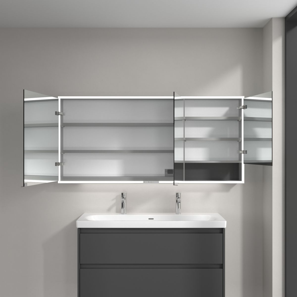 Das den Spiegel umgebende LED-Band sorgt für eine gleichmäßige Ausleuchtung, während die integrierte Waschtischbeleuchtung und die beleuchteten offenen Fächer eine stimmungsvolle Atmosphäre schaffen. Helligkeit und Farbtemperatur lassen sich bequem über einen Sensor oder einen Smart-Home-Controller einstellen. Die filigranen Griffe ermöglichen ein bequemes Öffnen der Türen ohne Fingerabdrücke, und die doppelte Steckdose im Inneren sorgt für zusätzliche Funktionalität.