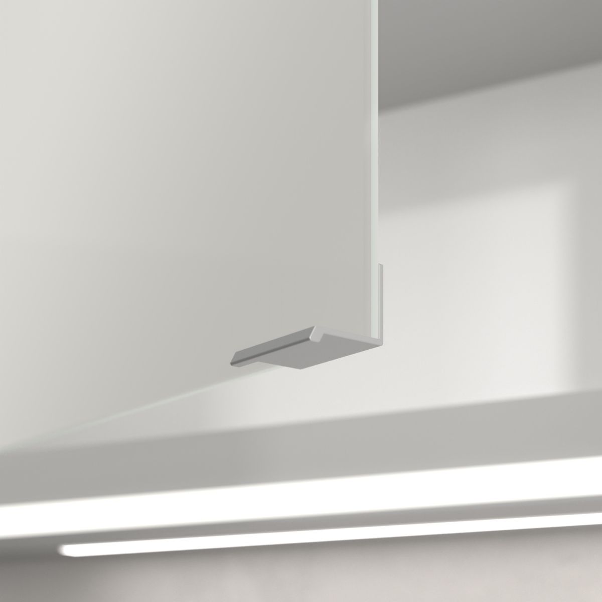 Das den Spiegel umgebende LED-Band sorgt für eine gleichmäßige Ausleuchtung, während die integrierte Waschtischbeleuchtung und die beleuchteten offenen Fächer eine stimmungsvolle Atmosphäre schaffen. Helligkeit und Farbtemperatur lassen sich bequem über einen Sensor oder einen Smart-Home-Controller einstellen. Die filigranen Griffe ermöglichen ein bequemes Öffnen der Türen ohne Fingerabdrücke, und die doppelte Steckdose im Inneren sorgt für zusätzliche Funktionalität.