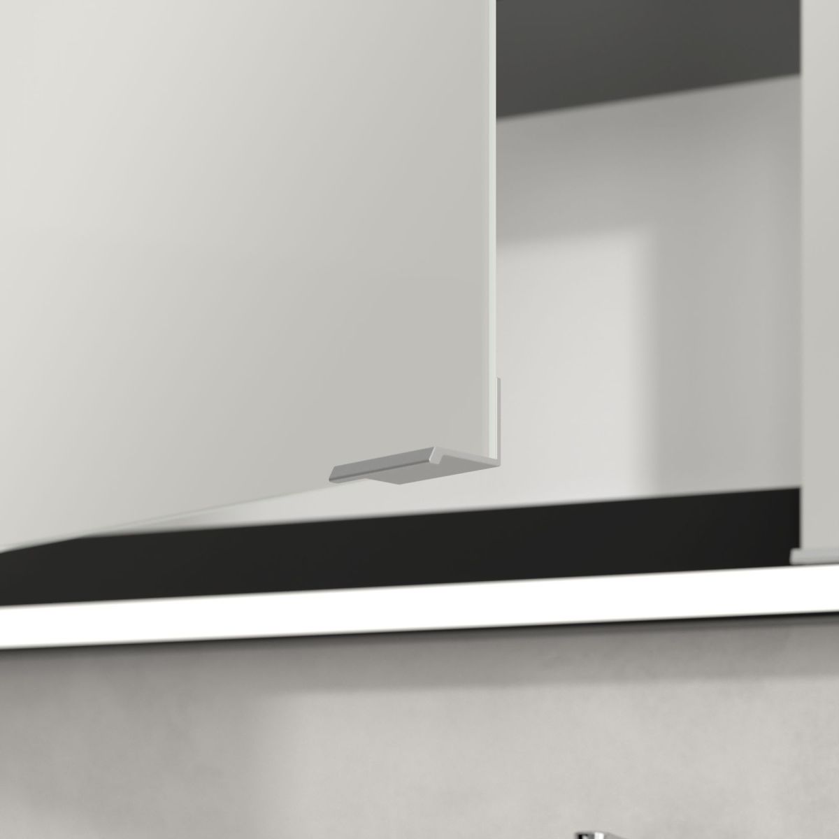Das den Spiegel umgebende LED-Band sorgt für eine gleichmäßige Ausleuchtung, während die integrierte Waschtischbeleuchtung und die beleuchteten offenen Fächer eine stimmungsvolle Atmosphäre schaffen. Helligkeit und Farbtemperatur lassen sich bequem über einen Sensor oder eine Smart-Home-Steuerung regulieren. Dezente Griffe ermöglichen ein komfortables Öffnen der Türen ohne Fingerabdrücke, und eine doppelte Steckdose im Inneren sorgt für zusätzliche Funktionalität.