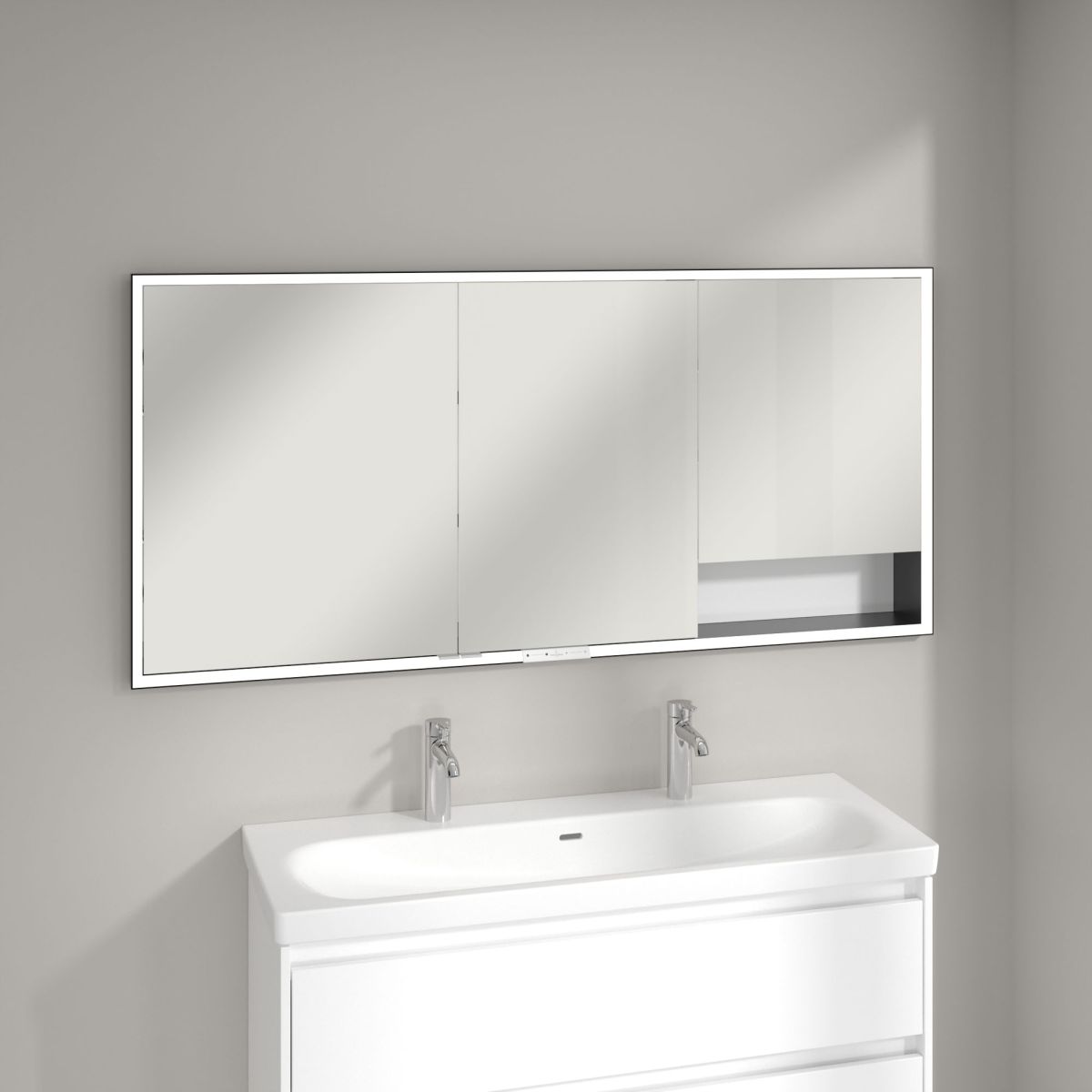 Eine raffinierte und attraktive Lösung für das minimalistische Badezimmer – der Einbau-Spiegelschrank My View+ von Villeroy & Boch setzt mit intelligenten Funktionen und stilvollen Farbakzenten neue Maßstäbe. Der Schrank mit geschlossenen Fächern und offenen Kammern fügt sich perfekt in die Wand ein und sorgt für einen besonders eleganten, minimalistischen Effekt. Die farbige Rückwand setzt individuelle Farbakzente und Designelemente im Badezimmer.